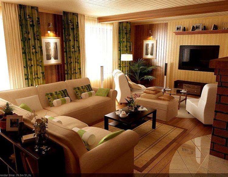 Los muebles verdes en una casa de troncos se ven muy armoniosos. Recuerda la unidad con la naturaleza.