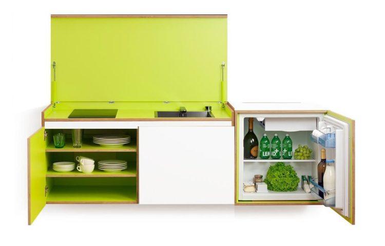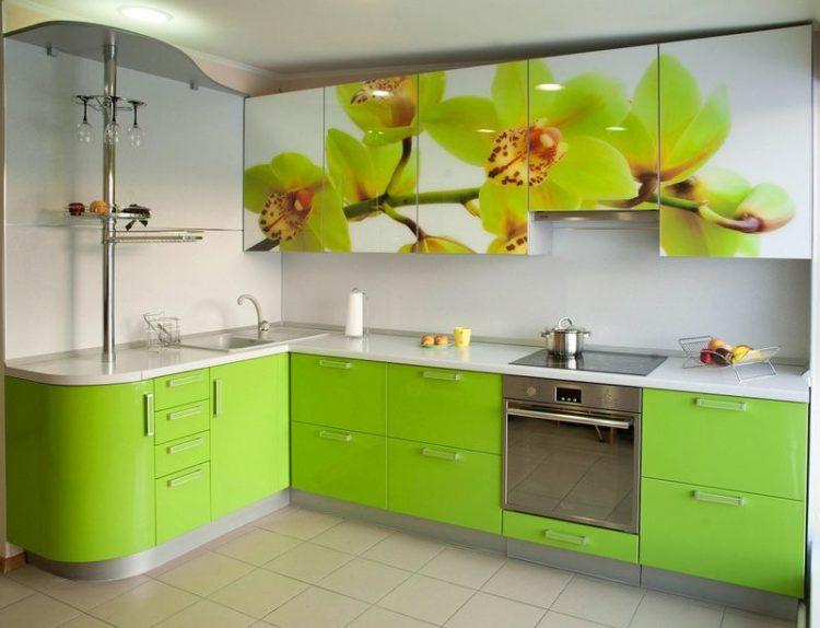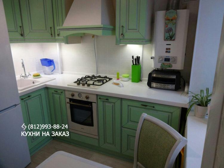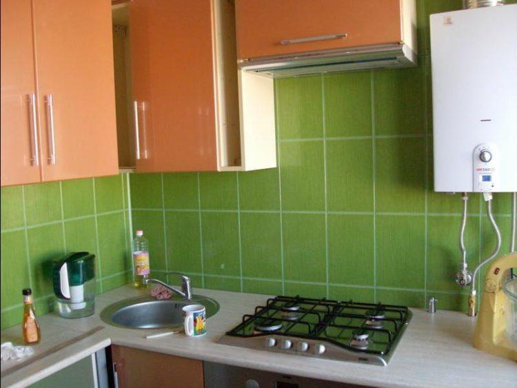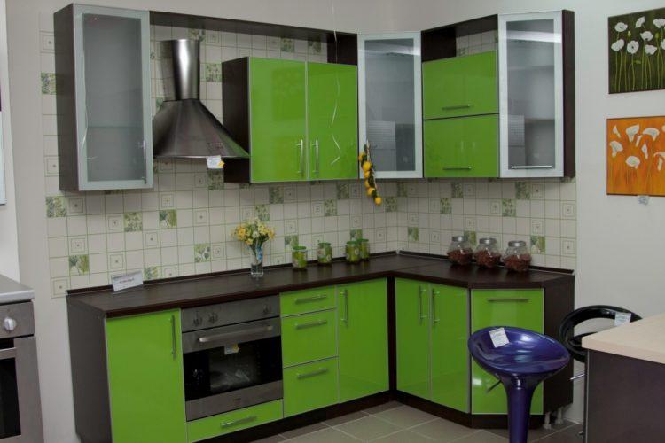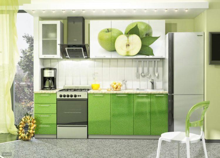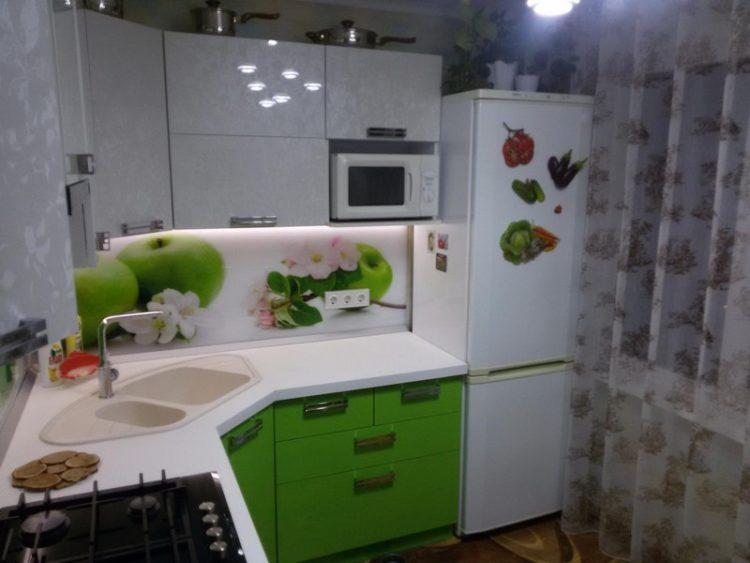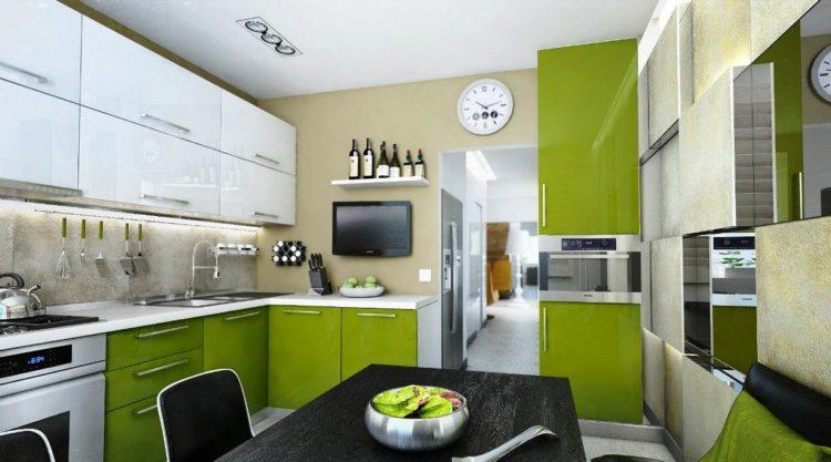 El diseño de la cocina en Jruschov en tonos verdes es la opción más adecuada que refrescará el espacio.