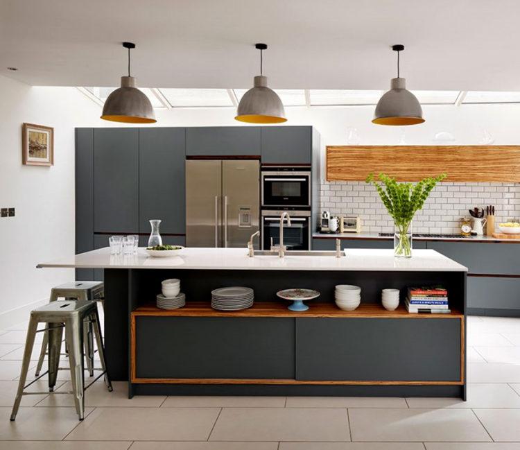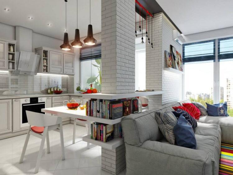 El diseño de la cocina en el estilo escandinavo no es muy bienvenido en colores oscuros. Sin embargo, si la cocina no es pequeña, y aún mejor, si se trata de una sala de estar de estilo escandinavo (puede ver las fotos interiores de tales espacios a continuación), entonces es bastante apropiado usar elementos suficientemente grandes de colores muy oscuros. Por ejemplo, piso o muebles. Pero los tonos básicos deben permanecer claros (de lo contrario no será un estilo escandinavo).