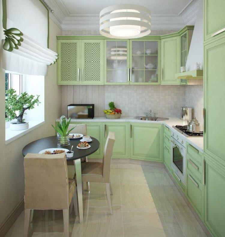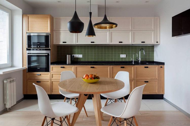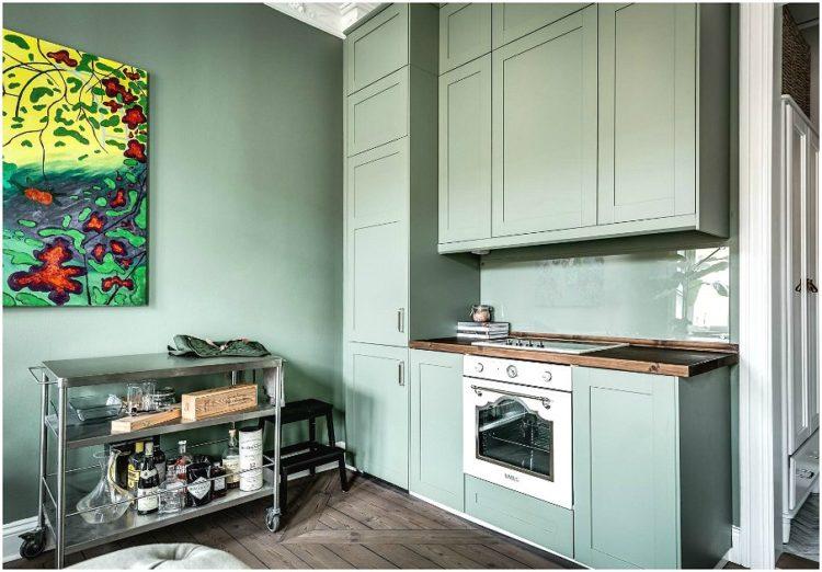 Si desea agregar verde a su cocina de estilo escandinavo, las fotos pueden ayudarlo con esto. Por lo general, el verde combina bien con los tonos beige y blanco, lo que permite diluir el interior con un par de detalles brillantes de este color. Por ejemplo, sillas o un jarrón sobre la mesa.