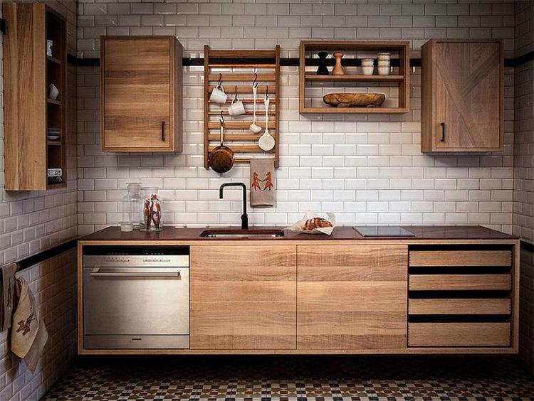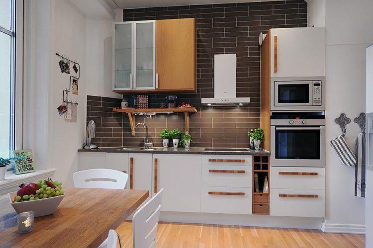 El estilo escandinavo en la cocina permite la presencia de colores marrones, porque este es el color del laminado (incluso se permite un laminado de un color muy oscuro). Los muebles y el delantal también pueden ser marrones.