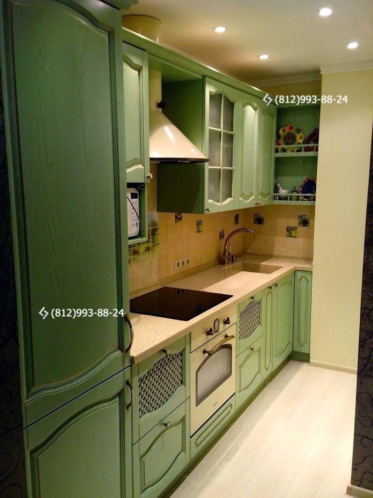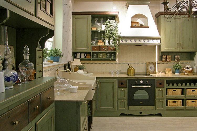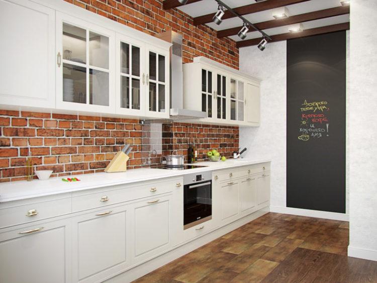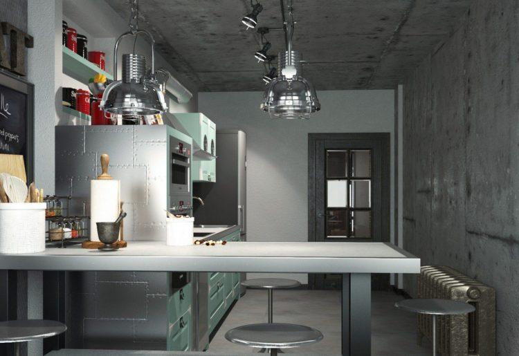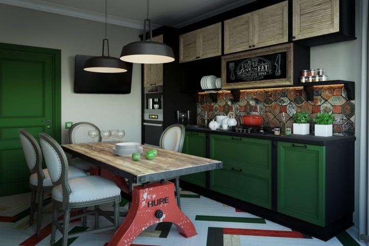 El interior verde de la cocina de estilo loft combinado con detalles en blanco diluirá algo de grosería y agregará frescura al apartamento.