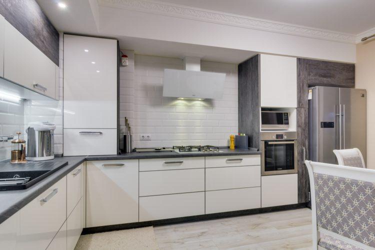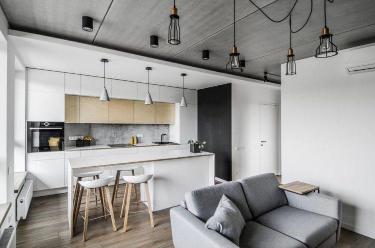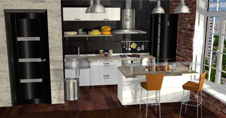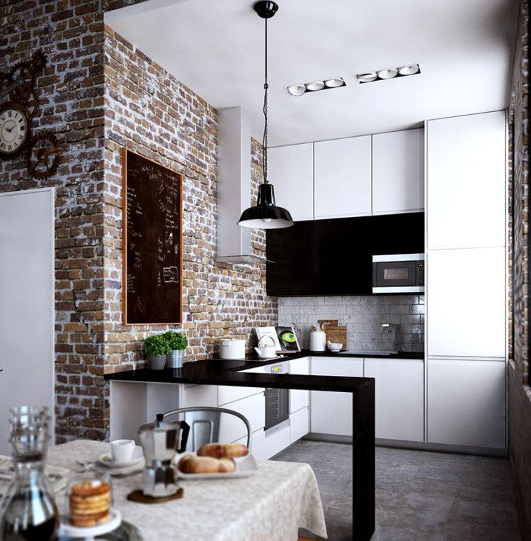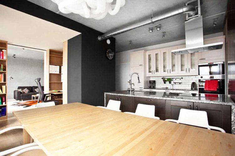 La cocina de estilo loft negro en el apartamento con predominio del blanco será un buen ejemplo del contraste, que siempre está de moda.