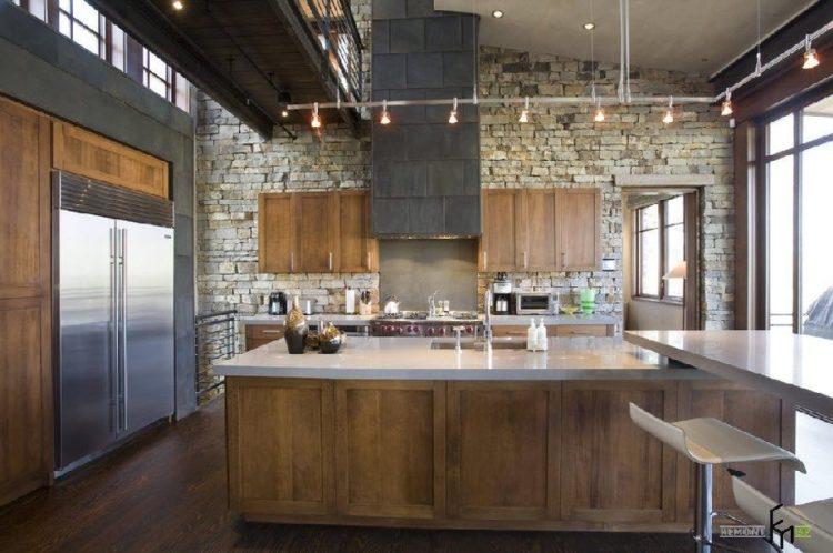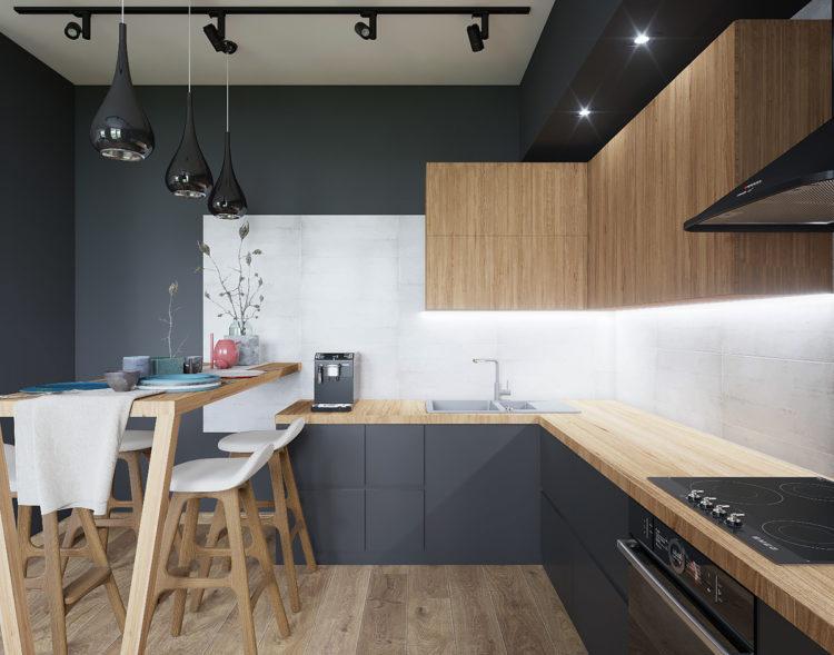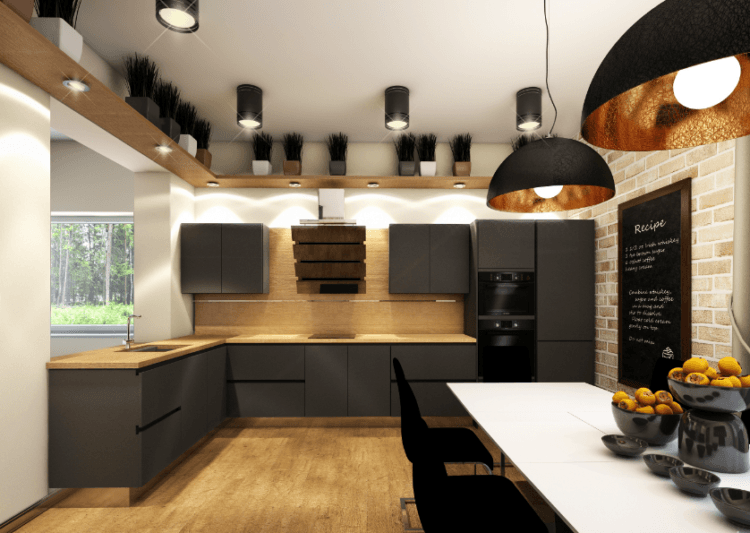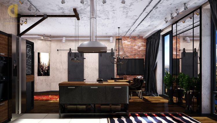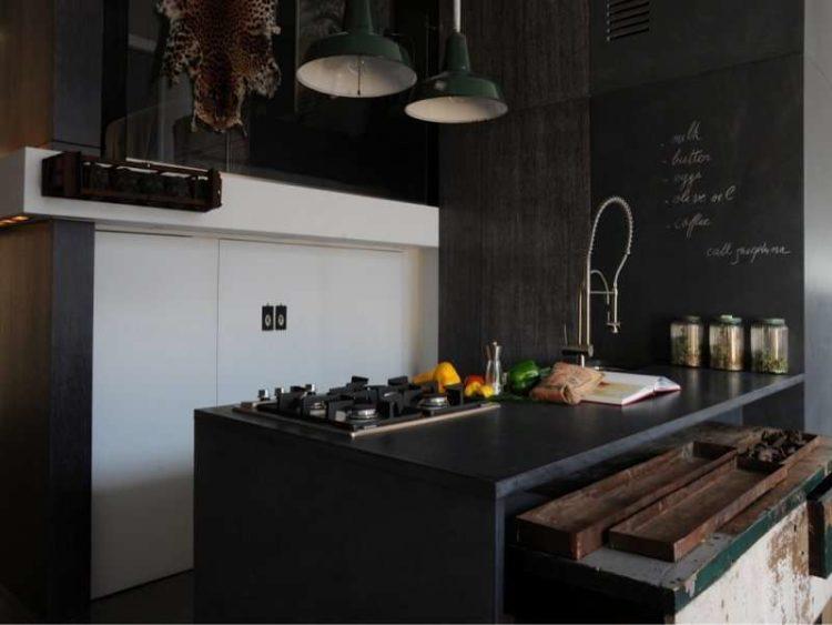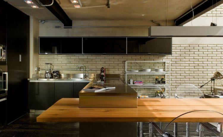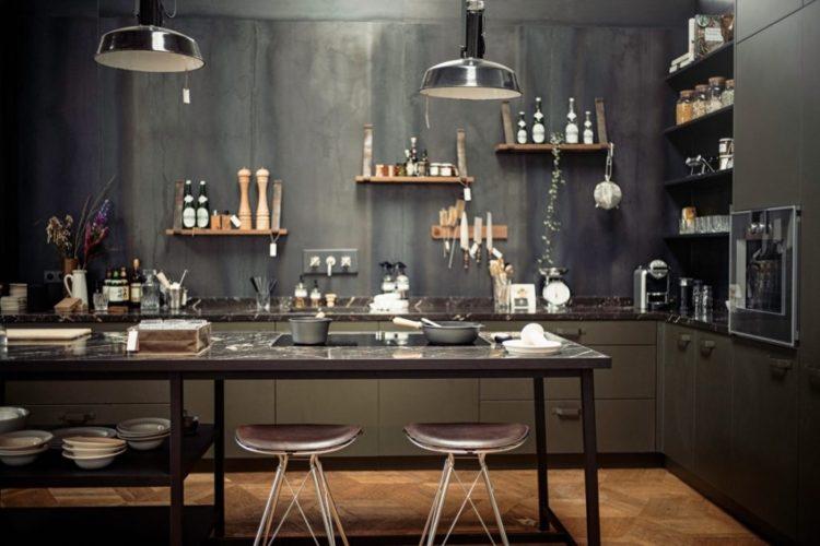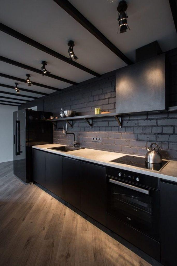 El diseño de la cocina tipo loft en color oscuro creará una sensación de plenitud, pero combina bien con paredes rugosas.