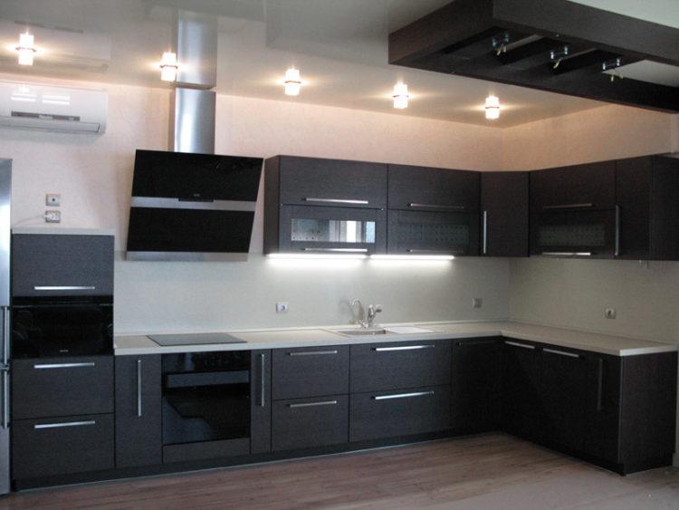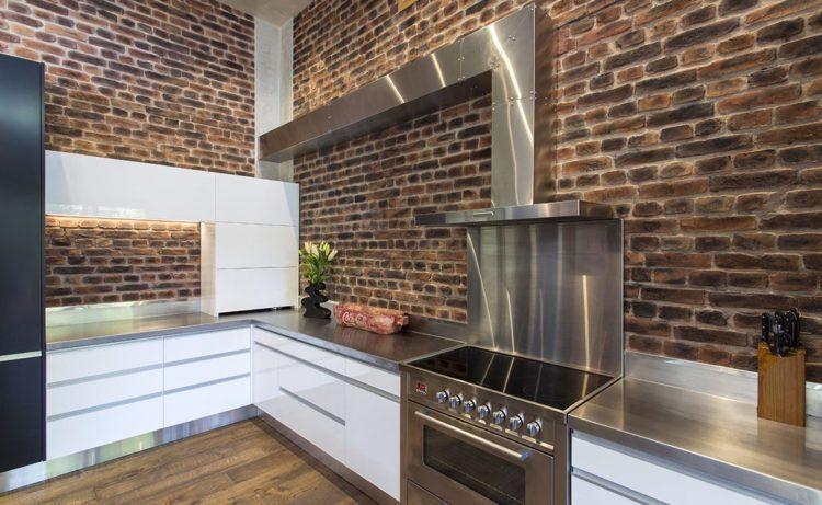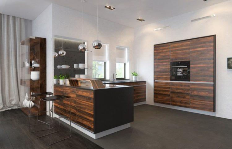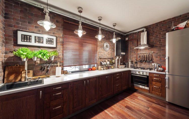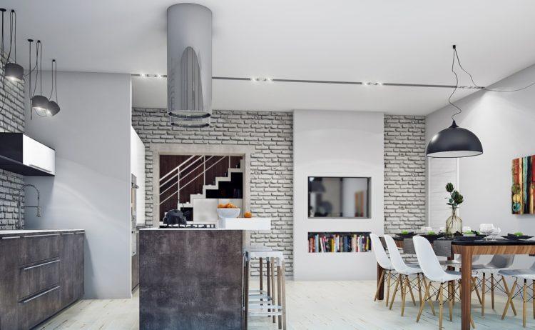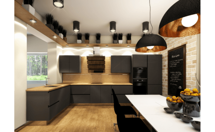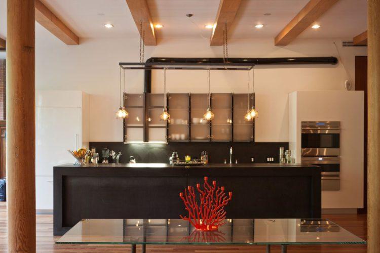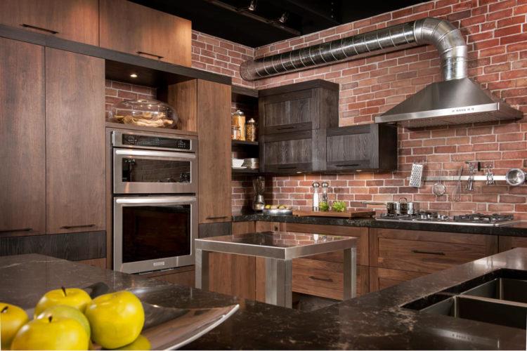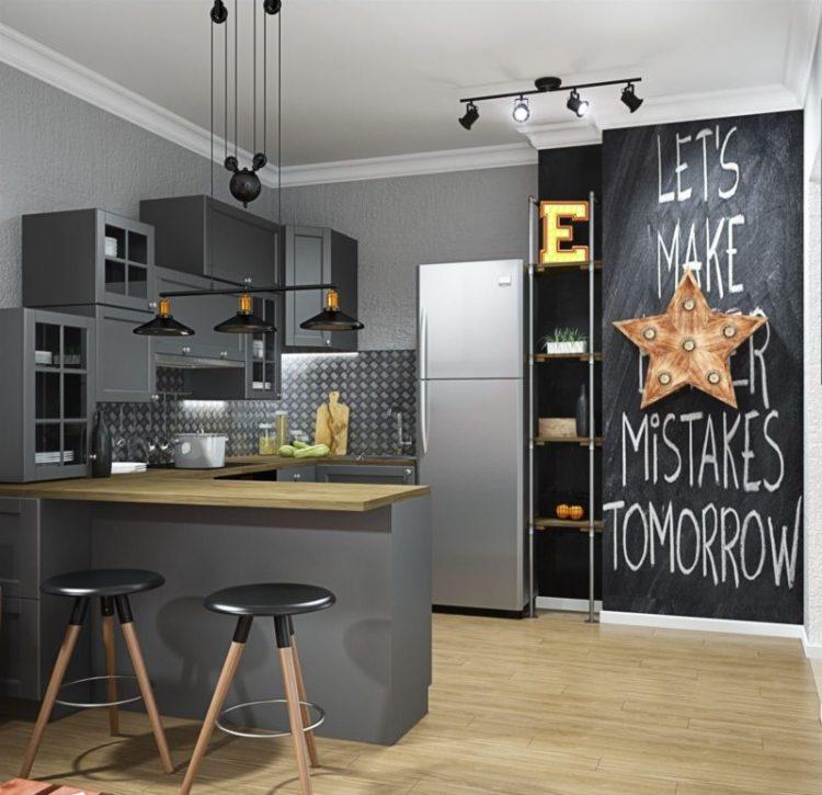 El diseño de la cocina tipo loft en color oscuro creará una sensación de plenitud, pero combina bien con paredes rugosas.