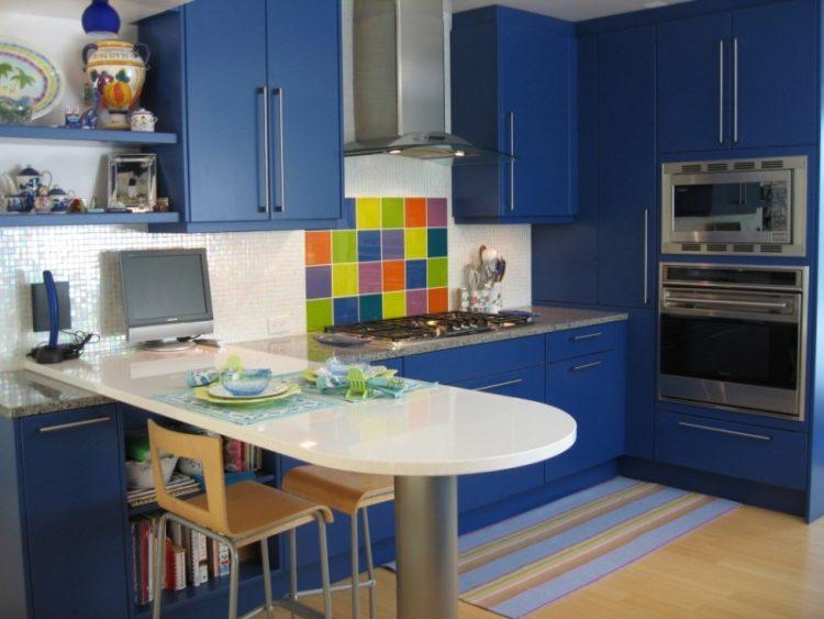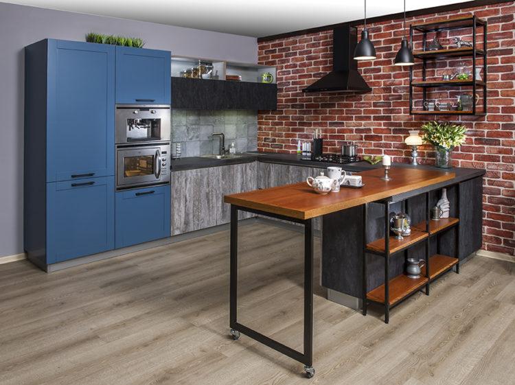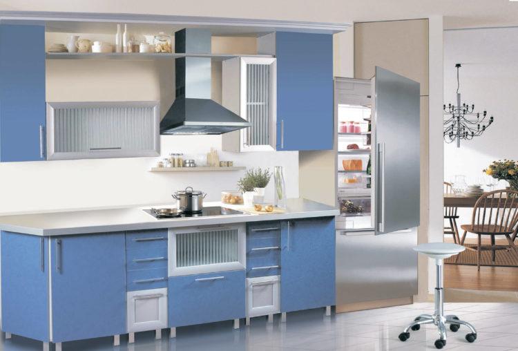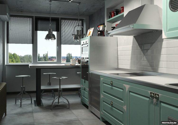 La atmósfera de calma y comodidad es creada por el estilo loft en el interior de la cocina, hecha en tonos azules, y si agrega un juego de cocina en el estilo loft blanco, obtendrá una simulación de la superficie del océano.