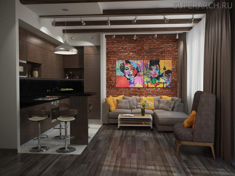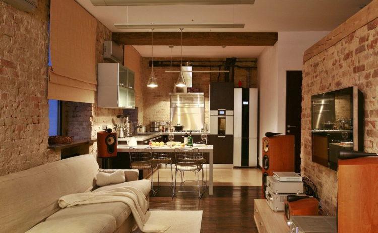 La sala de estar en el estilo loft, hecha en un diseño marrón, es perfecta para el color de los ladrillos, creando así una sensación de unidad de los conjuntos y las paredes.