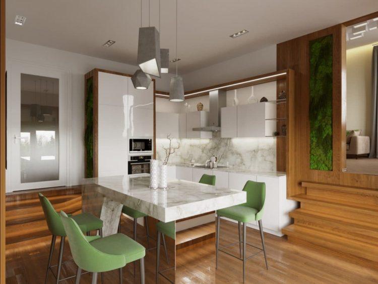 El diseño de estilo escandinavo utiliza el blanco de manera muy activa. Es el más adecuado para la cocina, ya que crea una sensación de limpieza y aumenta la luz, que es importante para la habitación en la que se prepara la comida. En una casa de ladrillo, parte de las paredes de la cocina no se pueden cubrir con yeso, sino solo pintarse de blanco. Estilo escandinavo clásico en los proyectos de fotografía interior en colores blancos: