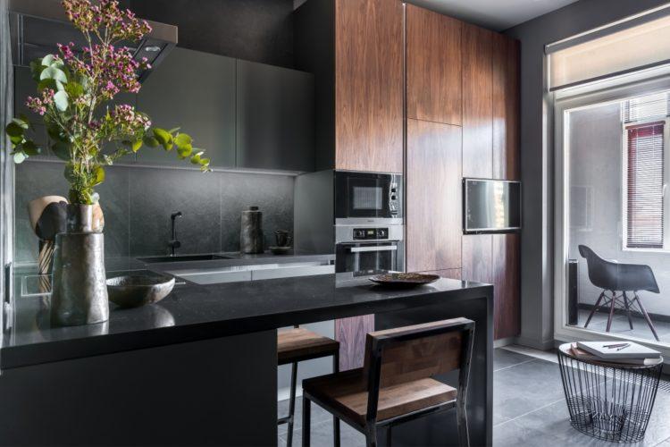 Dark se ve elegante siempre que la cocina esté conectada a la habitación contigua para que el espacio sea más tangible.
