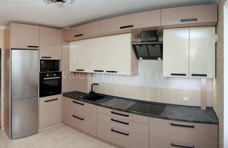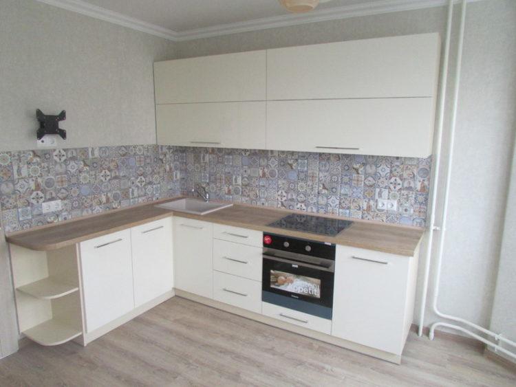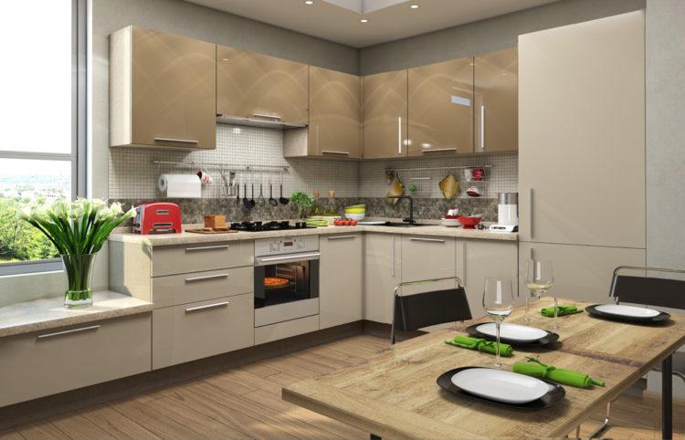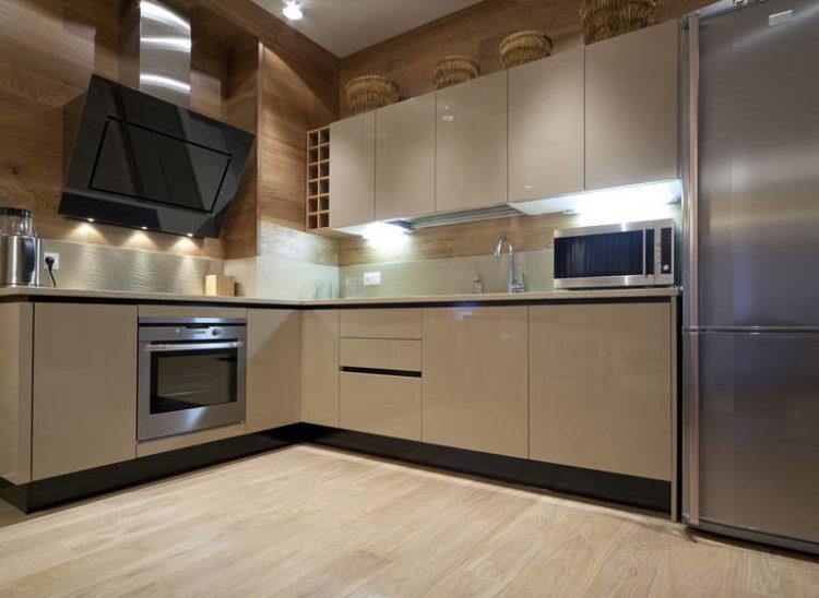 La cocina de esquina beige para cocina pequeña es una de las mejores opciones para tonos claros. El beige es neutral y no tan brillante como el blanco.