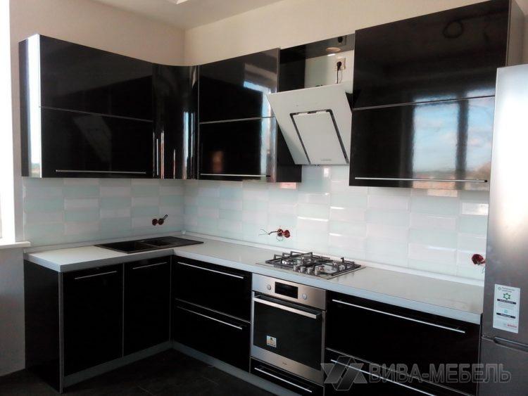 La cocina moderna bien puede ser negra. El juego de cocina de esquina para una pequeña cocina en negro, diluido con inserciones contrastantes, se verá elegante e inusual.
