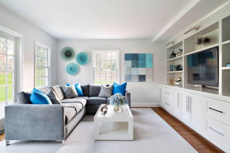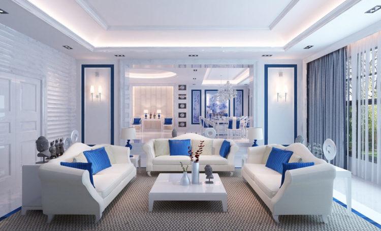 El efecto del azul en el cuerpo tiene el mismo efecto relajante en el cuerpo que el verde. Pero a diferencia de los tonos de follaje, el azul relaja el cuerpo, ayuda a reducir la presión arterial y alivia el síndrome de hiperactividad en bebés inquietos. La actividad mental entre las paredes de azul, por el contrario, se concentra. Los papeles pintados de color azul serán una opción adecuada si la sala de estar se utiliza como lugar de trabajo, estudio o juegos al aire libre para niños que son difíciles de calmar. Fondo de pantalla azul en la habitación, foto en el apartamento: