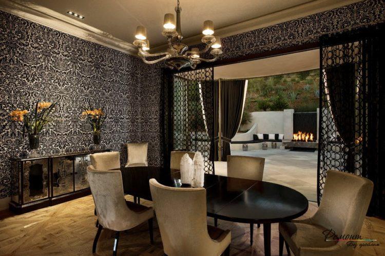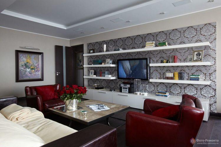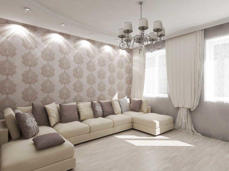 Una habitación con papel tapiz gris se ve reservada y lujosa al mismo tiempo. El gris es un color complejo y variable que puede verse diferente y transmitir diferentes sensaciones dependiendo de la elección del tono. El diseño de papel tapiz para el salón, combinado con un tinte gris, le permite dividir efectivamente la habitación en zonas, para construir ópticamente el espacio.