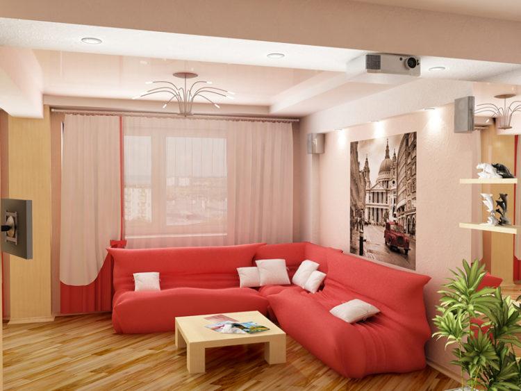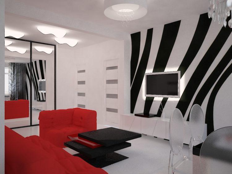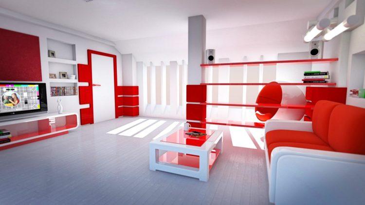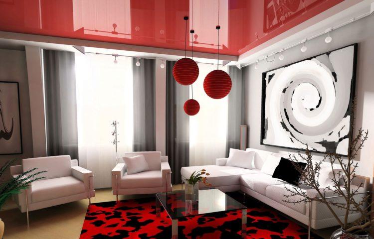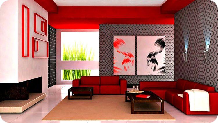 El uso del rojo en la decoración de las paredes ayuda a crear una atmósfera de vigor, energía y actividad. Este color contribuye a la sensación de calor, provoca un ligero aumento en la presión arterial, la liberación de la hormona dopamina en la sangre. Pero, como cualquier factor que provoque excitación, su exceso puede causar fatiga e irritación. La opción de rojo se recomienda para decorar las paredes de la sala de estar, donde se planean fiestas regulares.