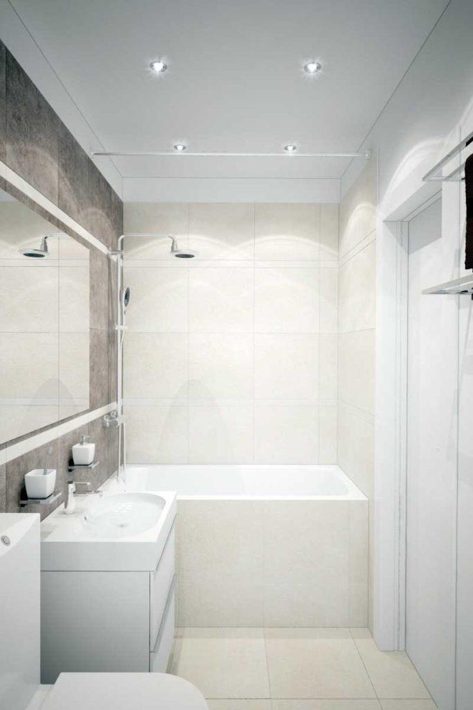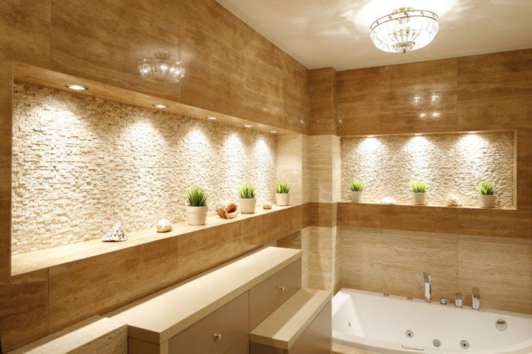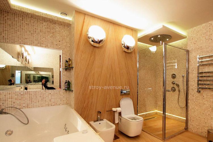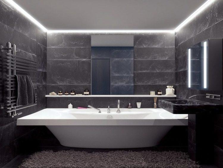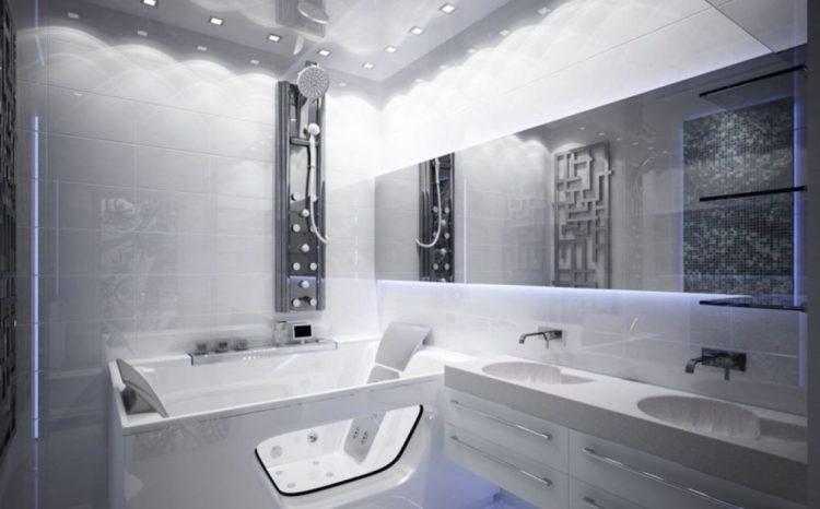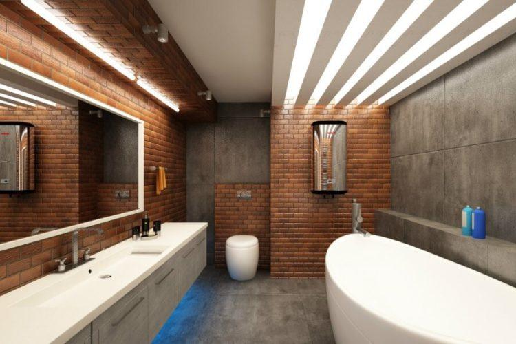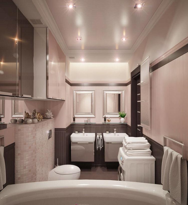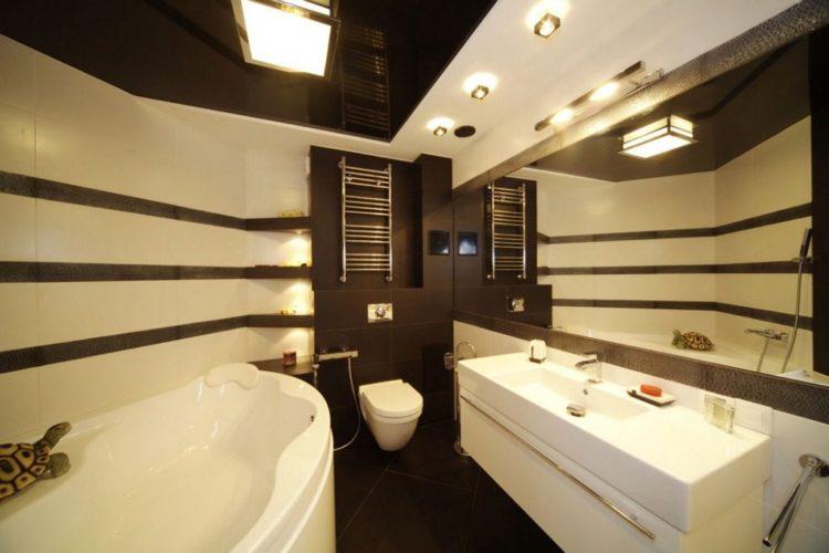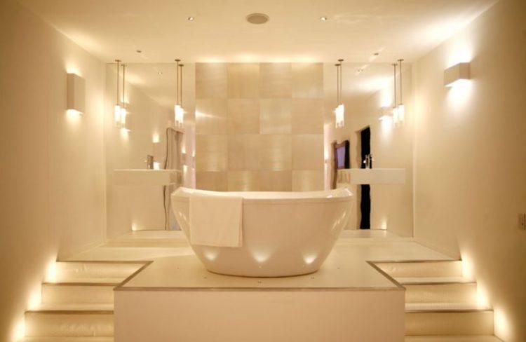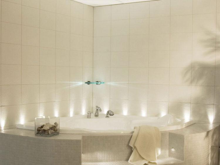 La iluminación en un baño pequeño será diferente a la de una habitación grande. La iluminación para un baño pequeño debe ubicarse en los lugares más correctos: el techo, cerca de los espejos, para no sobrecargar el interior. Las lámparas en el baño en el techo (las fotos lo ayudarán a ver las opciones más actuales) pueden ser de diferentes tamaños, pero tampoco debe cargar todo el techo con ellas. Para un baño grande, la iluminación LED en el baño desempeña el papel de la decoración, creando un ambiente íntimo. Puede ver las opciones para el interior del baño y la ubicación de la iluminación en la foto.
