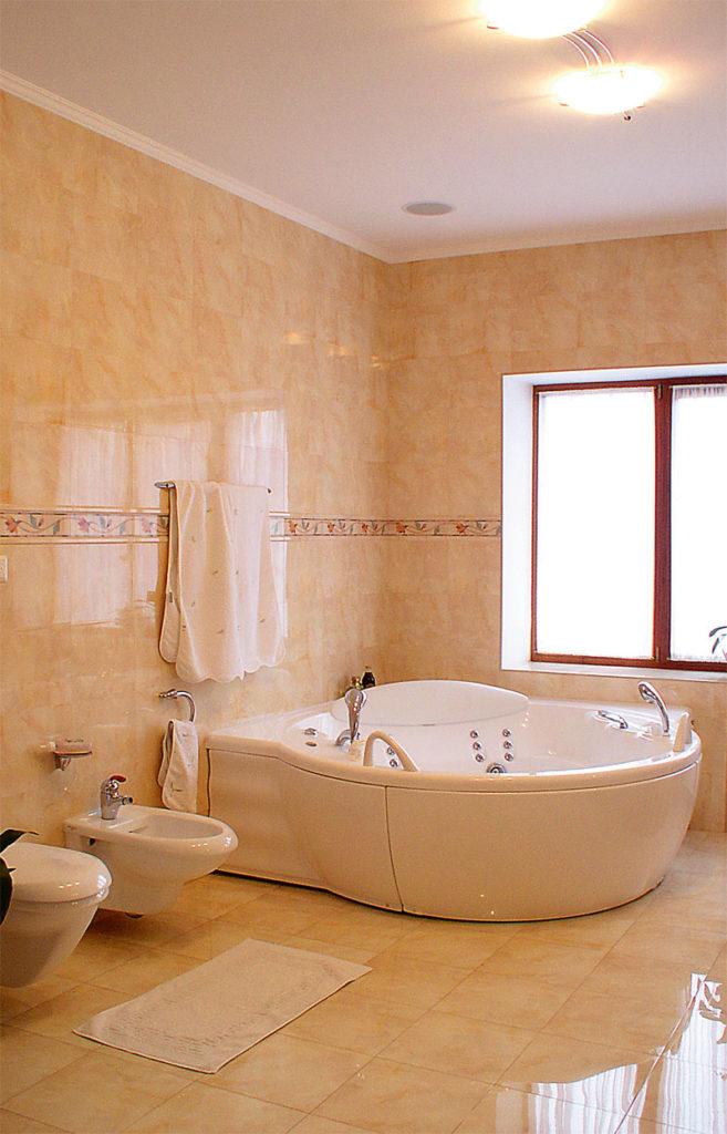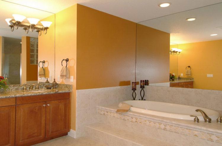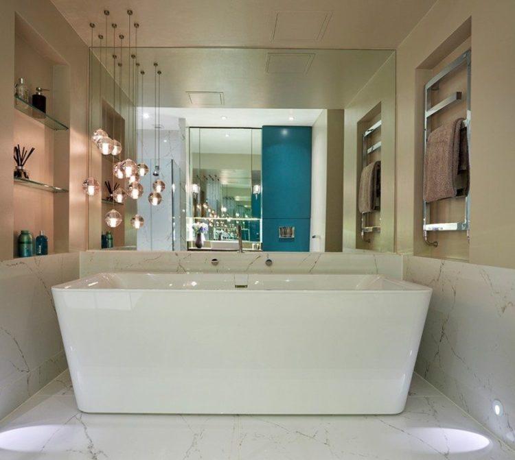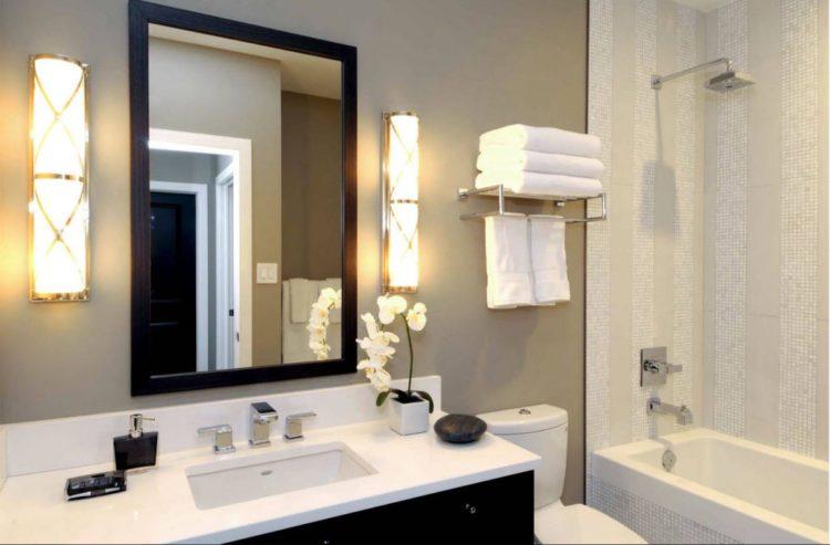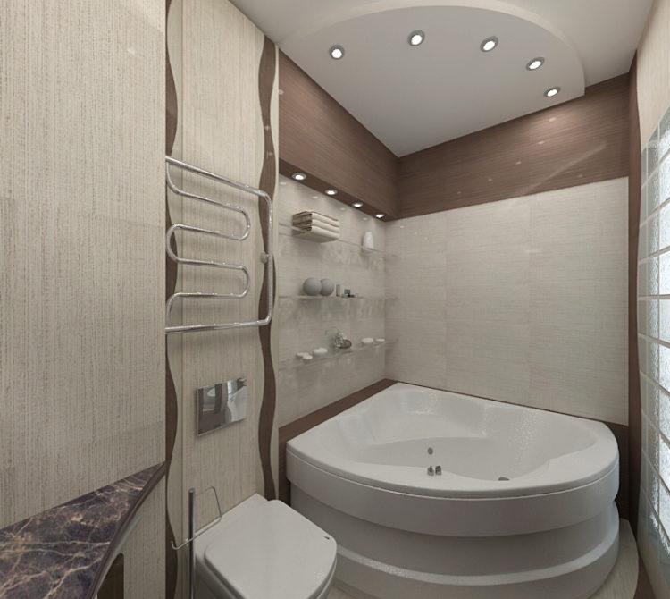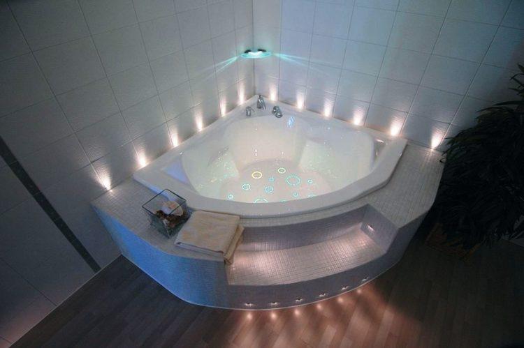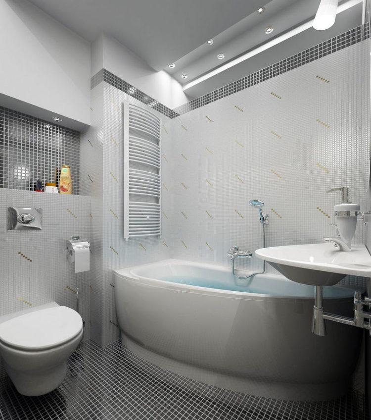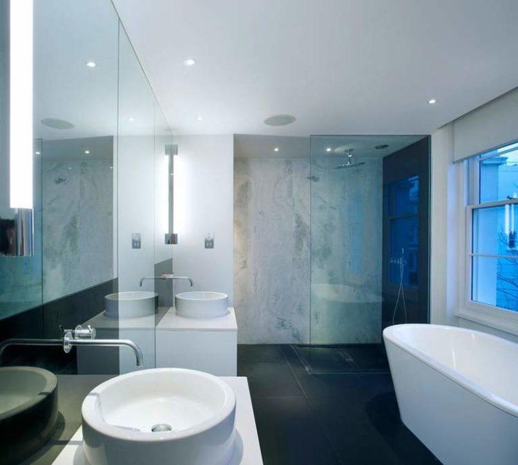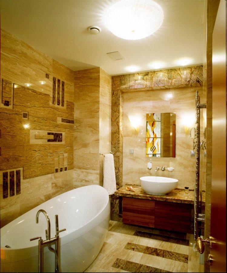 La iluminación en un baño pequeño será diferente a la de una habitación grande. La iluminación para un baño pequeño debe ubicarse en los lugares más correctos: el techo, cerca de los espejos, para no sobrecargar el interior. Las lámparas en el baño en el techo (las fotos lo ayudarán a ver las opciones más actuales) pueden ser de diferentes tamaños, pero tampoco debe cargar todo el techo con ellas. Para un baño grande, la iluminación LED en el baño desempeña el papel de la decoración, creando un ambiente íntimo. Puede ver las opciones para el interior del baño y la ubicación de la iluminación en la foto.