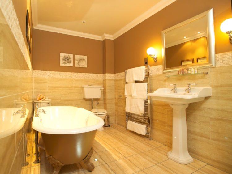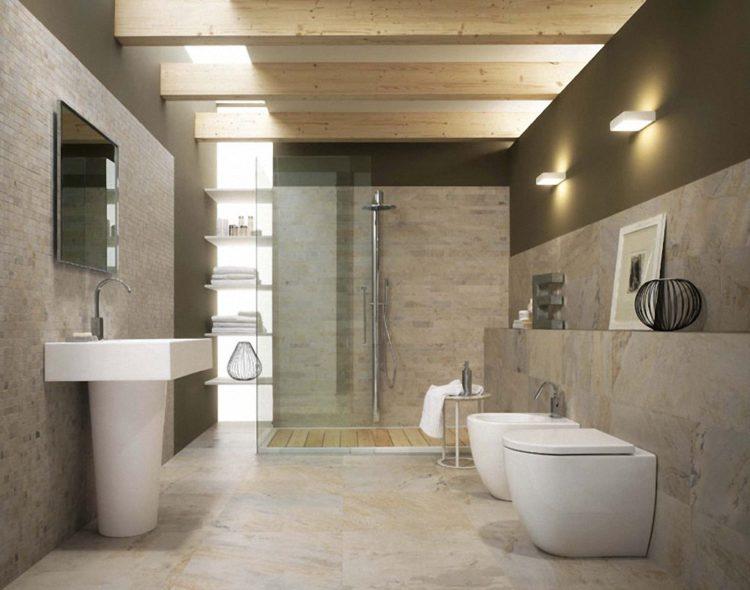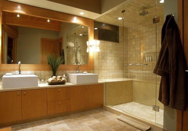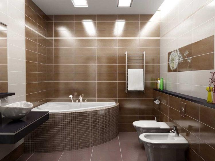 Hermoso interior marrón estará en un baño grande. En un poco mejor combinarlo con la luz. La lámpara del baño puede ser marrón, como elemento de decoración.