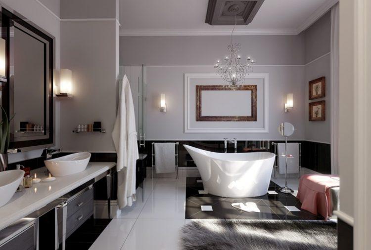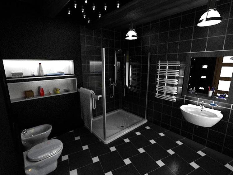 Este es el baño en el que no se puede ahorrar en iluminación. La lámpara del baño negro es el elemento principal de la decoración y el aspecto general de la habitación.