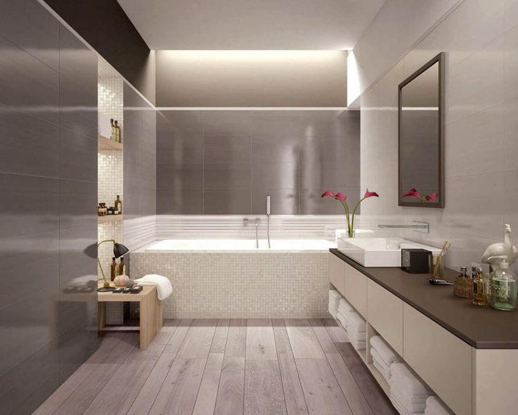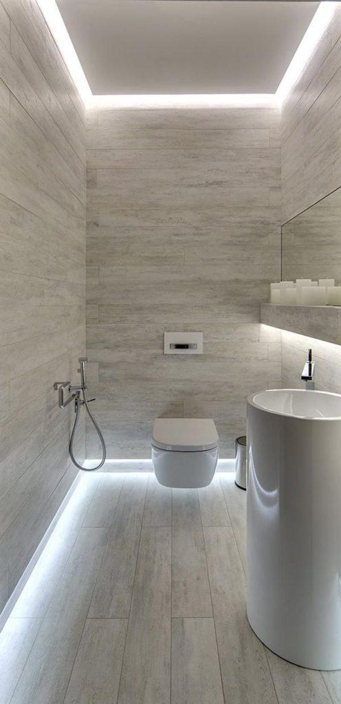 Alguien toma el color gris por algo oscuro. Pero si combina correctamente colores y acentos, entonces el baño en gris puede transformarse perfectamente. La iluminación del baño complementará el interior gris. Mira los mejores ejemplos de diseño en la foto a continuación.