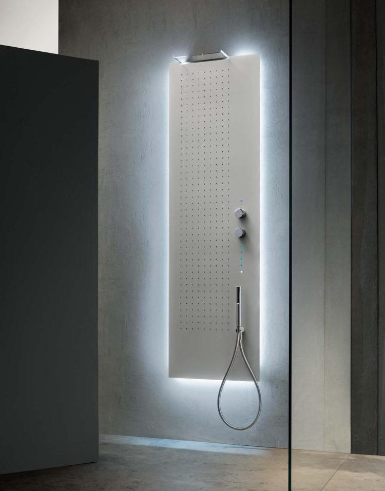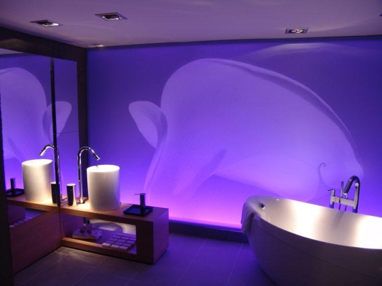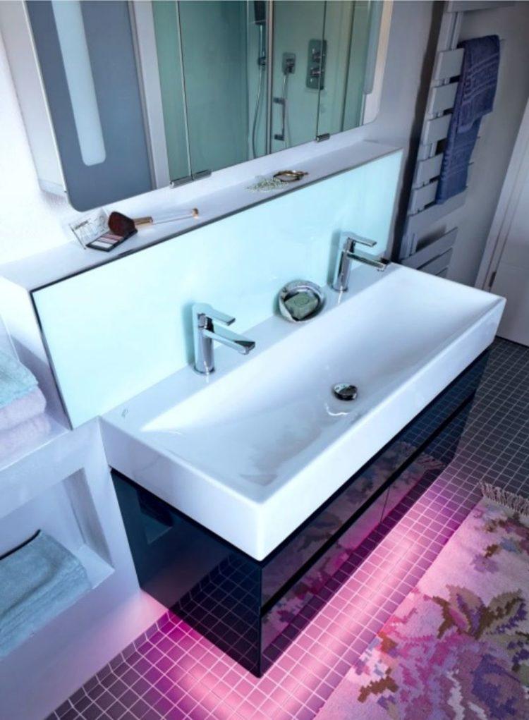 Por ejemplo, la iluminación en un baño con techo tensado será diferente de aquellas habitaciones donde la luz proviene de lámparas de pie o de la pared. Considere también la ubicación de la iluminación adicional. Es mejor elegir para lámparas adicionales aquellos lugares donde una persona pone su cara en orden. Esto suele estar cerca de un espejo con lavabo. Sugerimos que mire cuál puede ser la iluminación de un baño de varios colores, según la foto.