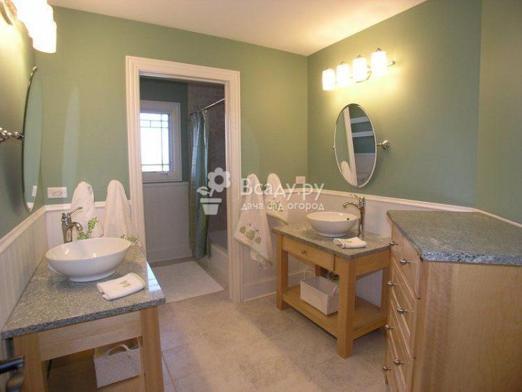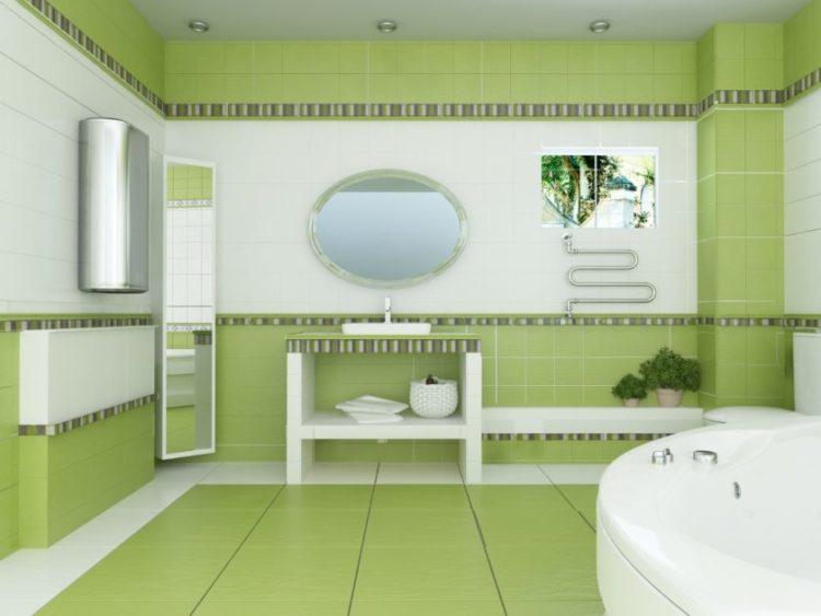 Aquí hay ejemplos de interiores de bañeras verdes. La iluminación en el baño puede ser techo, como base. Y la iluminación sobre el espejo en el baño se convertirá en una corriente de luz adicional.