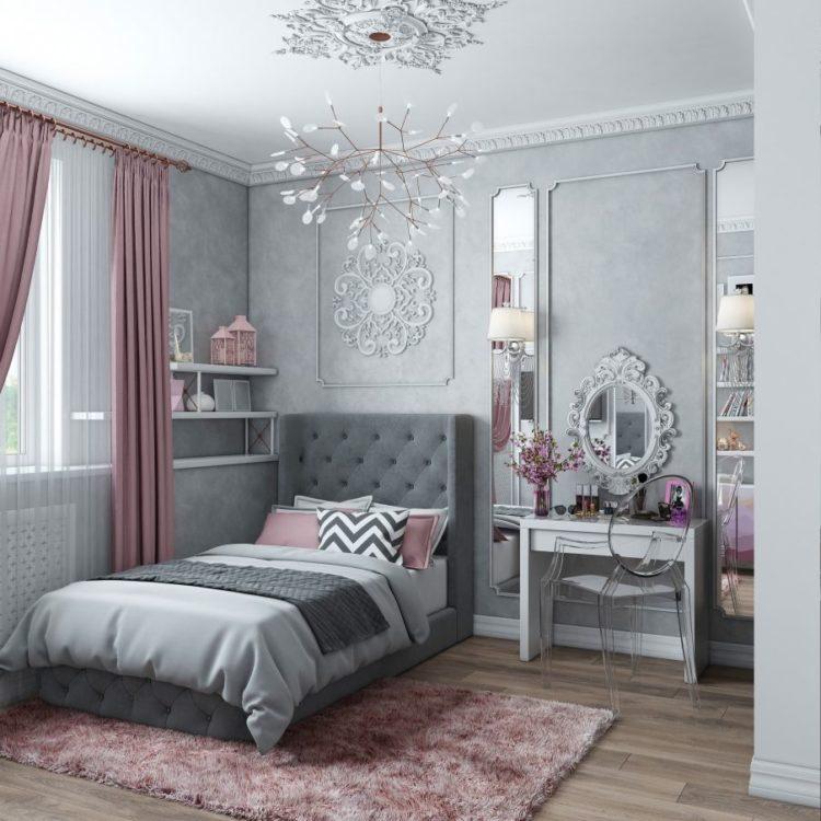 Los papeles pintados grises para las paredes en las que vive la niña también son adecuados, también puede diluir el gris con otros colores para darle más espacio al espacio.