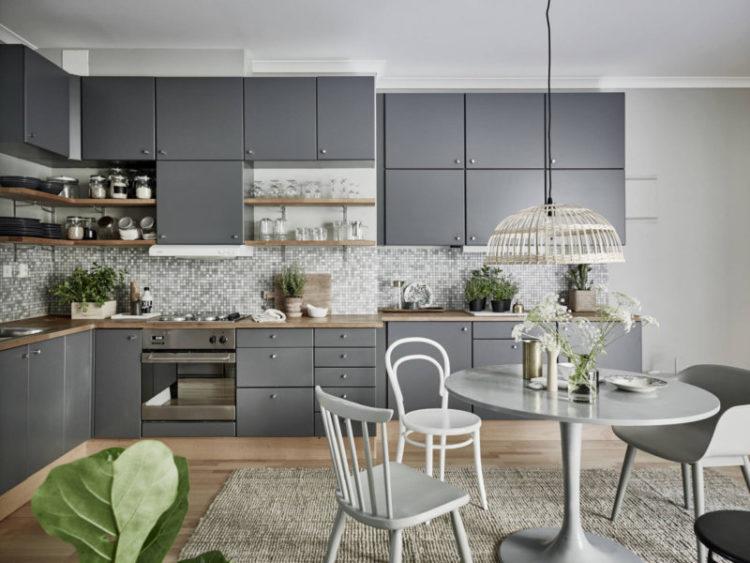 Los papeles pintados grises en la cocina de tonos mate aportarán frescura y pureza, mientras que los papeles pintados de acero o plata darán una idea del lujo y la innovación.