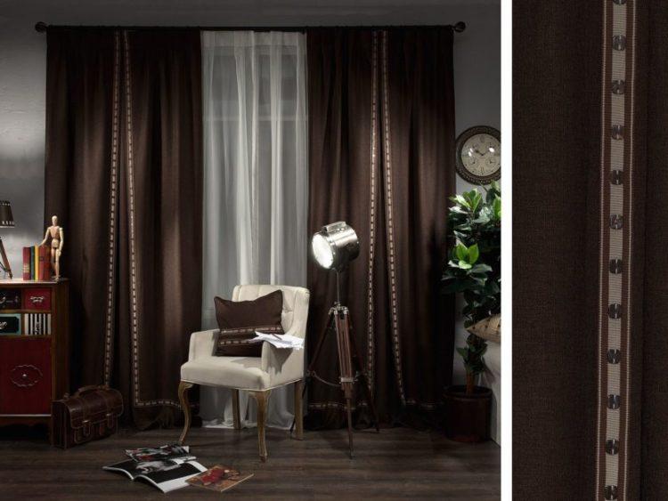 Las cortinas marrones en el pasillo en el interior de un apartamento común se ven muy bien en el interior de la sala de estar, el dormitorio y el pasillo. Una de las opciones interesantes son las cortinas de color marrón oscuro con muebles brillantes.