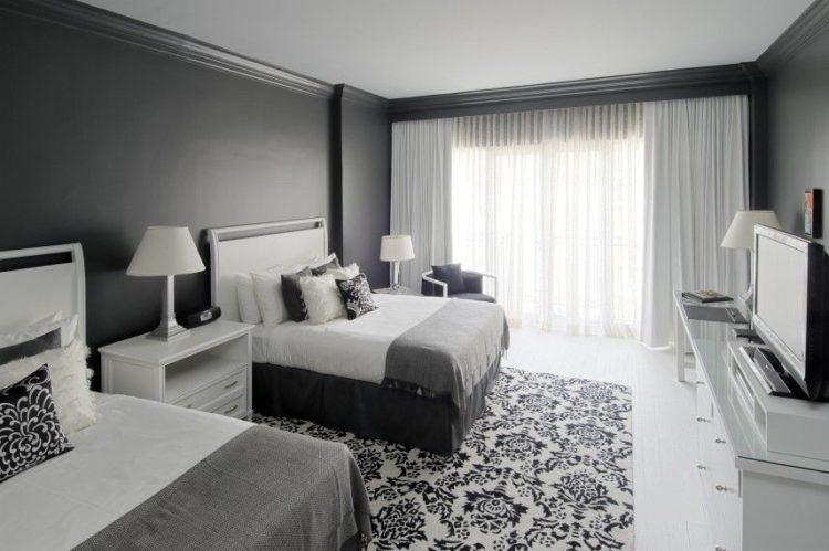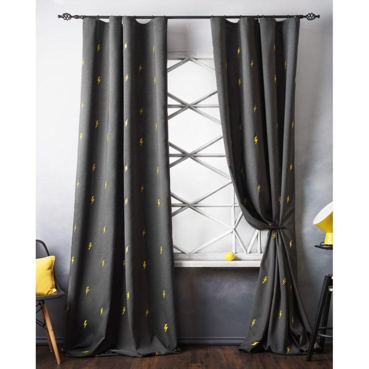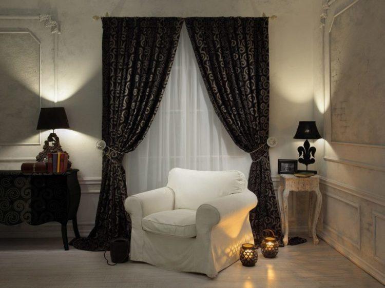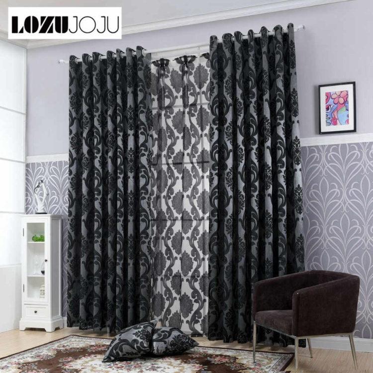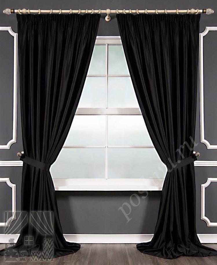 La mayoría de los expertos están de acuerdo en que las gruesas cortinas negras son más adecuadas para cualquier habitación, ya que su función es proteger a los que se acuestan temprano, se despiertan tarde y duermen a la mitad del día. El negro es un color clásico y acromático con temperatura de color cero, sin sombras. Es necesario usar el color negro en el interior de la habitación con extrema precaución, dada su peculiaridad de absorber la luz y reducir significativamente el espacio visual de la habitación. La principal ventaja del negro es que combina bella y fácilmente con todos los demás colores y sus tonos. Explore las cortinas de moda en el dormitorio 2018 nuevos artículos en la foto propuesta.