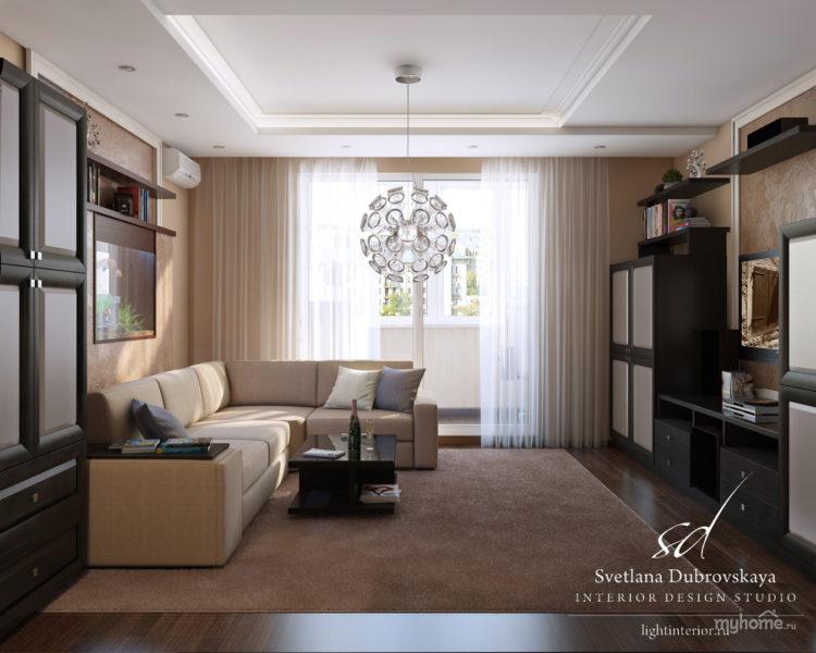 Una de las opciones más versátiles es el diseño de la sala en tonos marrones. Todo el mundo sabe, con una cama y armarios de madera, un clásico eterno.