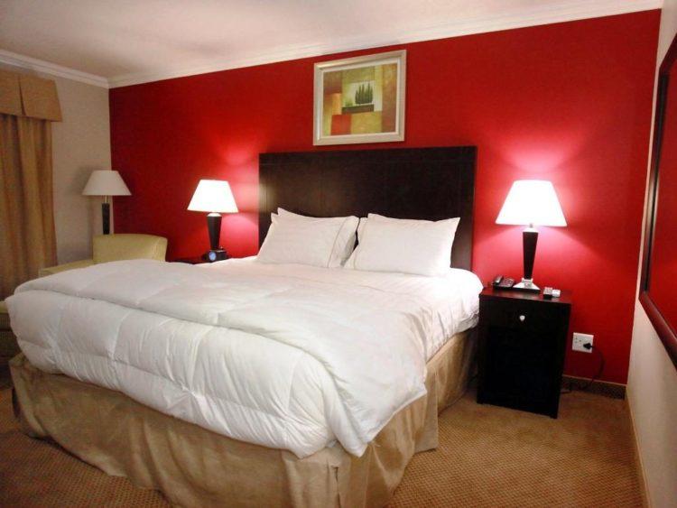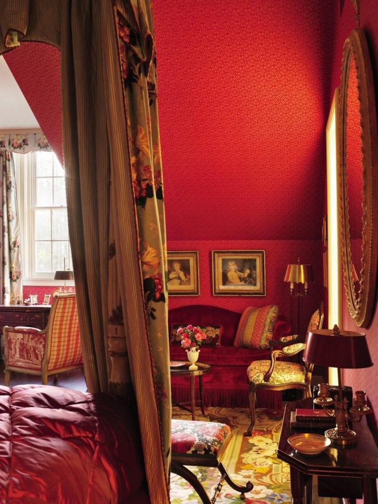 El dormitorio de la sala de estar roja, el diseño de la corteza está construido sobre una combinación de un tono blanco como dominante con otros, una opción para personas valientes.