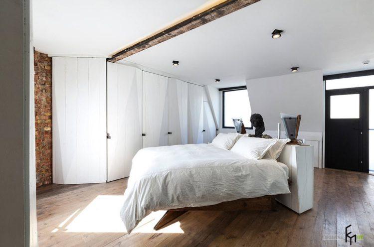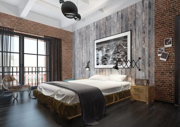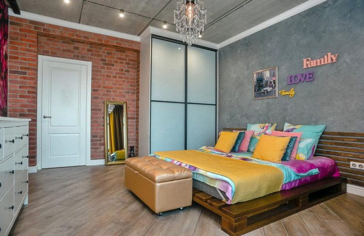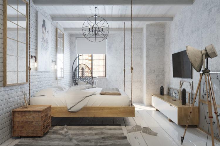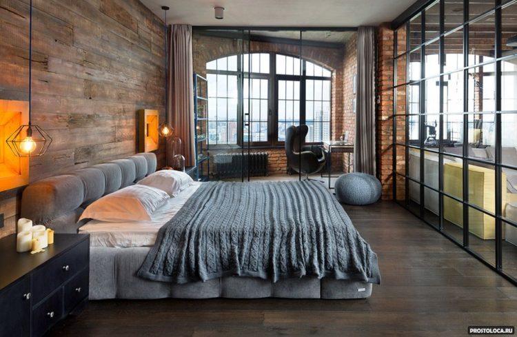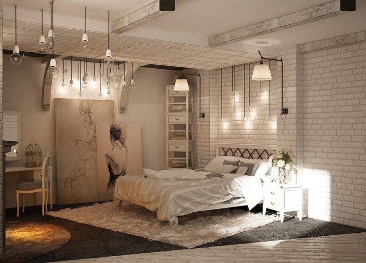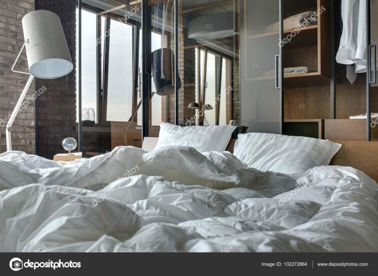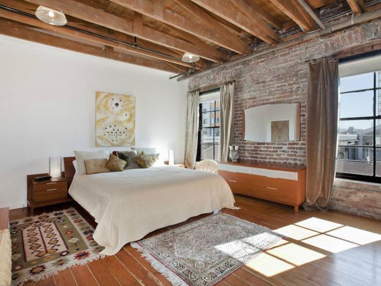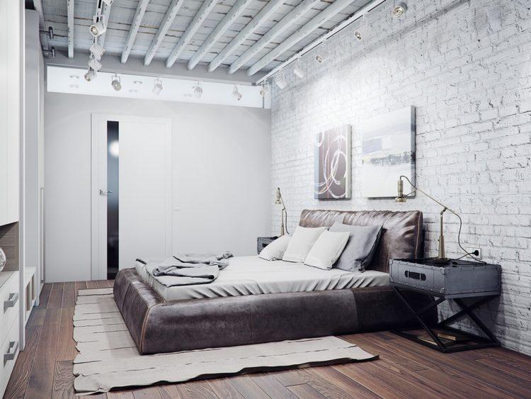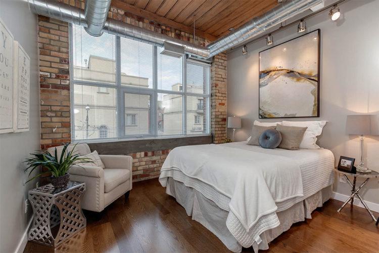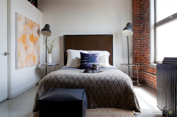 El estilo loft brillante en el dormitorio, cuya foto se presenta a continuación, es la clave para un ambiente relajante, tranquilo y apacible.