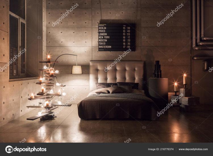 al contenido ↑Interior de dormitorio de estilo loft brillante