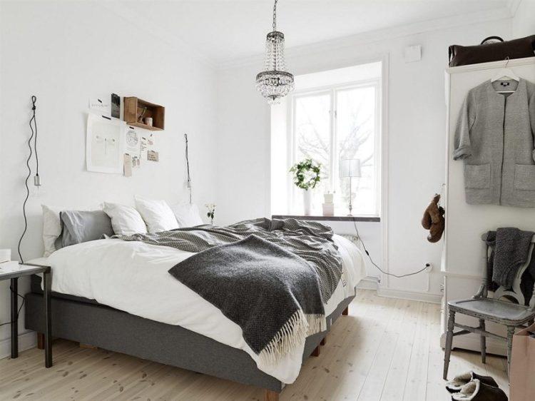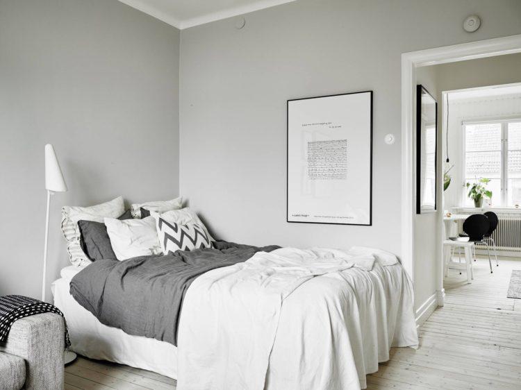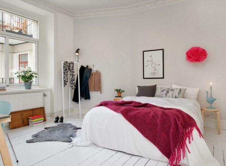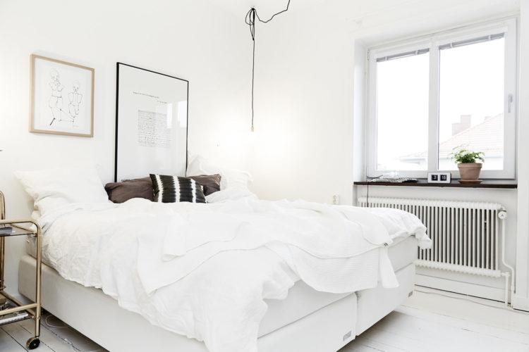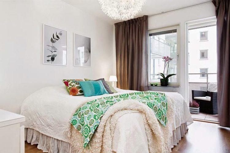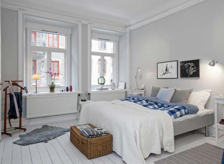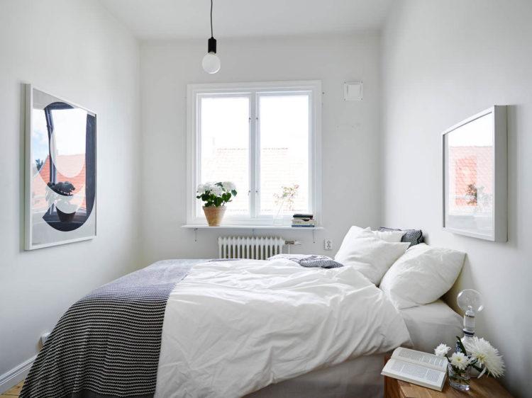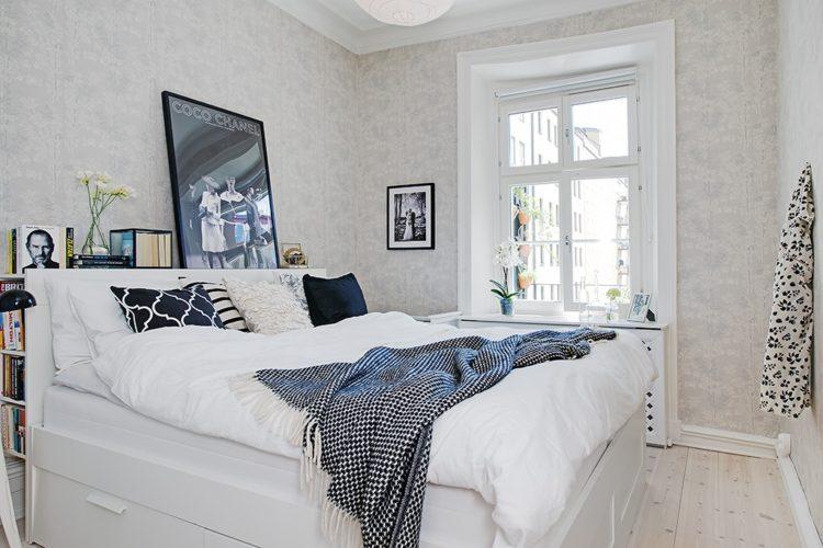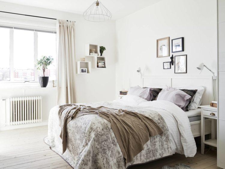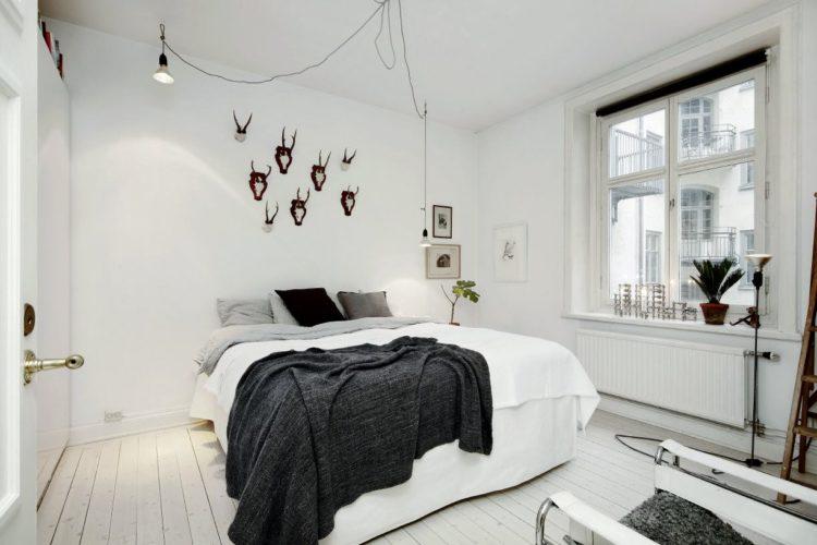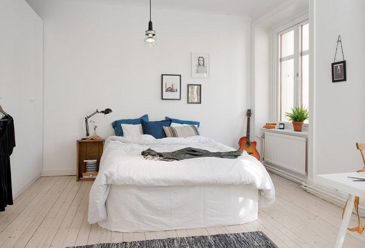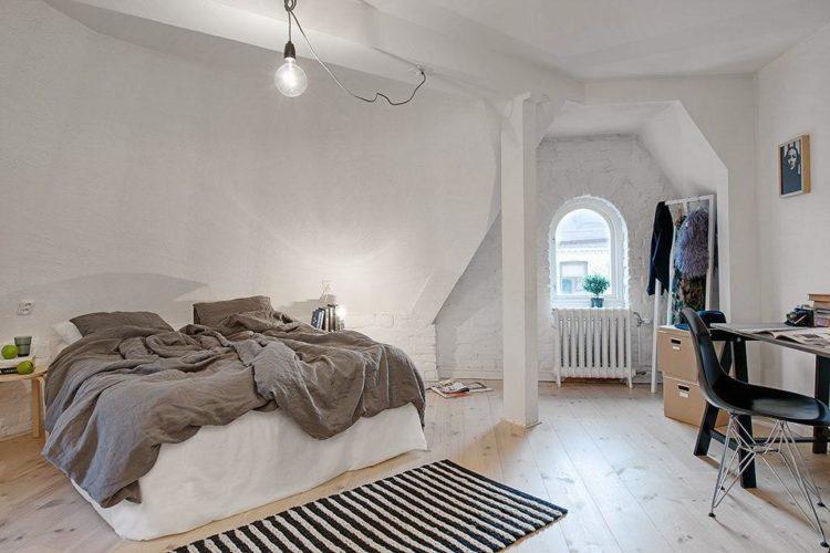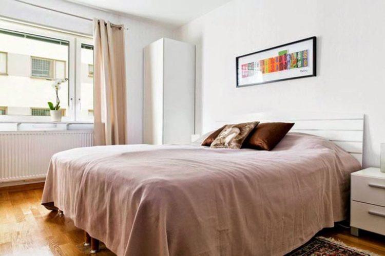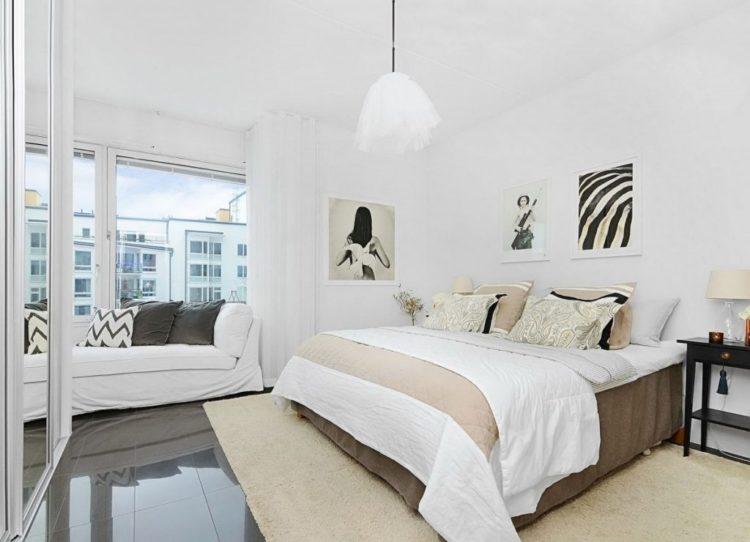 Las paredes blancas y los hermosos muebles en delicados colores naturales aumentan visualmente el espacio en la habitación. Pero la preferencia por colores tranquilos no significa en absoluto que la habitación o sala de estar escandinava se verá aburrida o carente de energía. Se pueden enfatizar muchos detalles interiores, como alfombras, ropa de cama, obras de arte, diversificando así el dormitorio sobrio en colores brillantes.