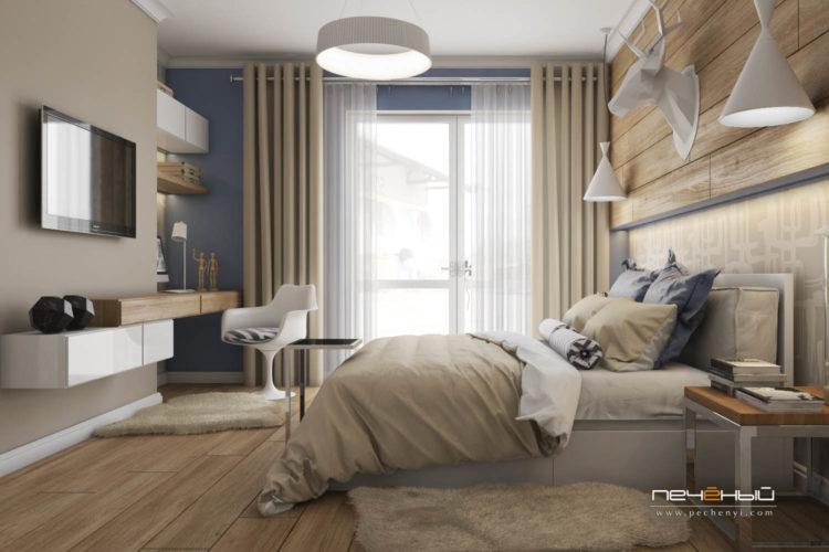 El diseño de la habitación en el estilo escandinavo (foto) llama la atención en el predominio de los detalles naturales. Marrón claro y crema claro: en colores tan hermosos puede haber un piso de madera, un armario de estilo escandinavo en el dormitorio y otros muebles.