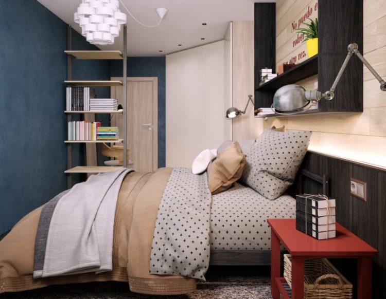 El dormitorio para un adolescente en el estilo loft puede ser azul, de modo que después de un día activo puede calmarse y relajarse.