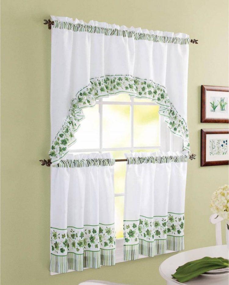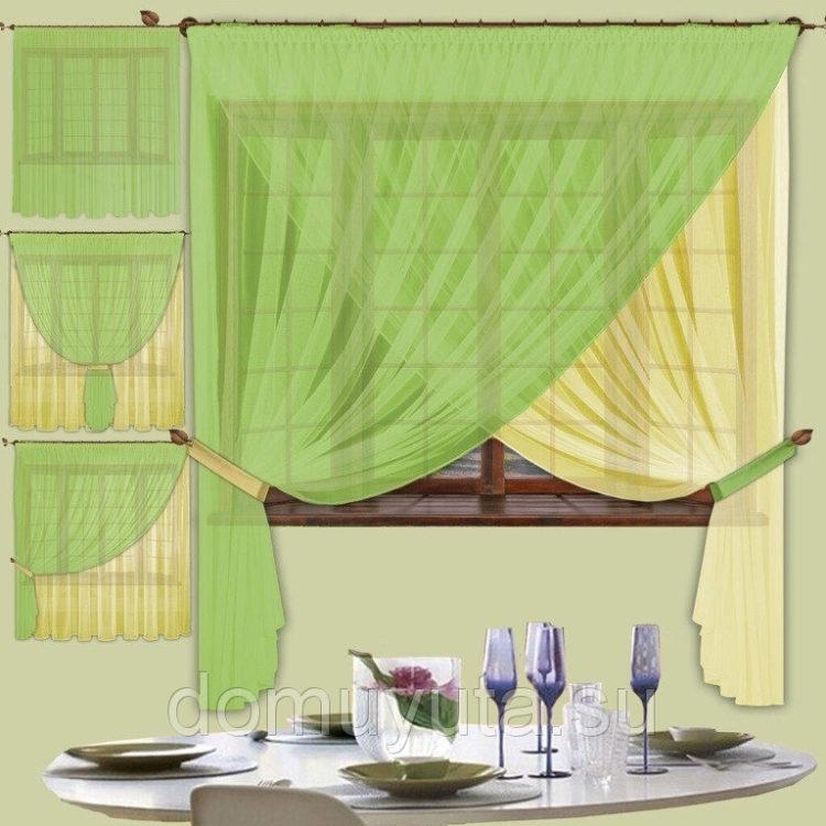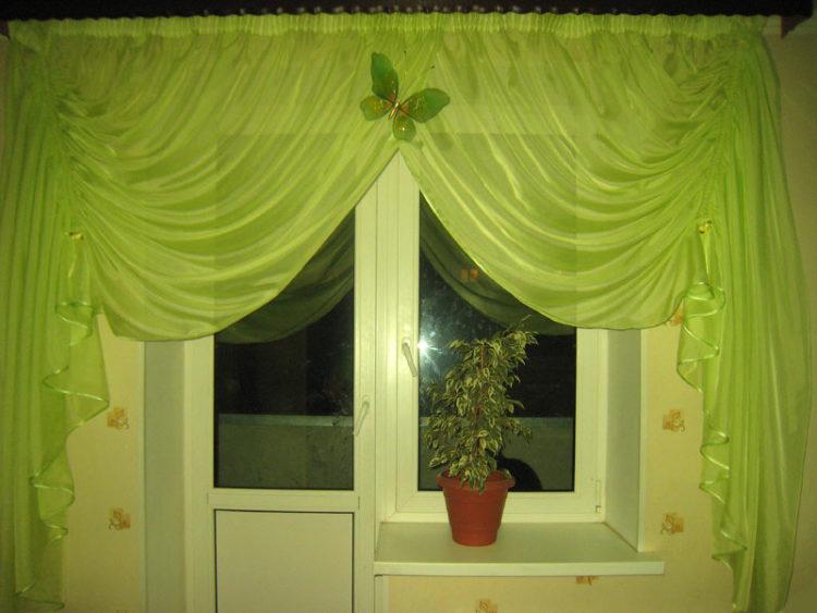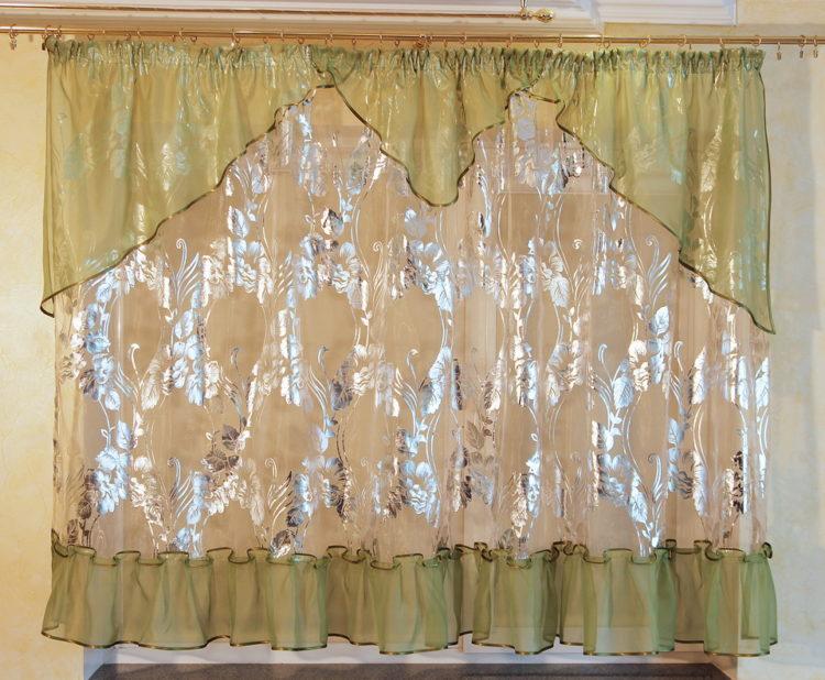 En el caso de que el interior de su cocina esté dominado por el verde, puede elegir un tul claro claro en la cocina (foto) en tonos verdes.