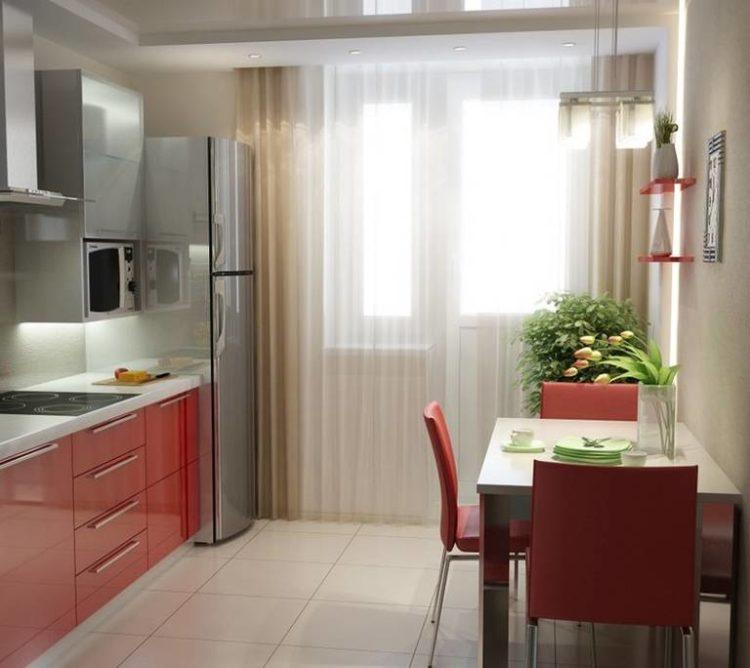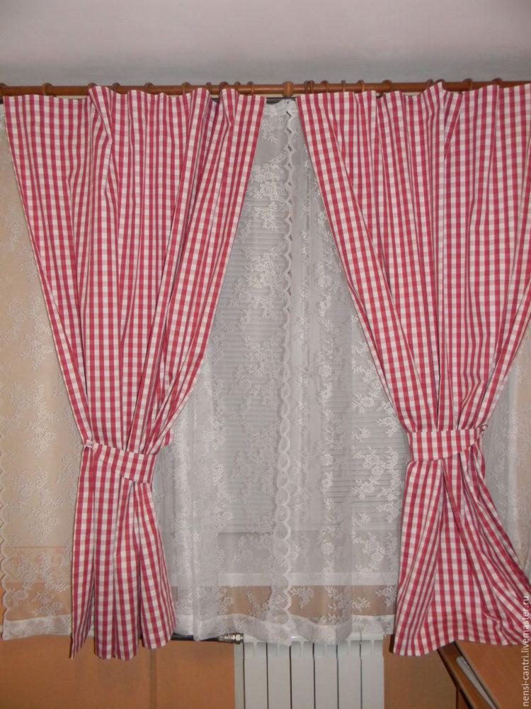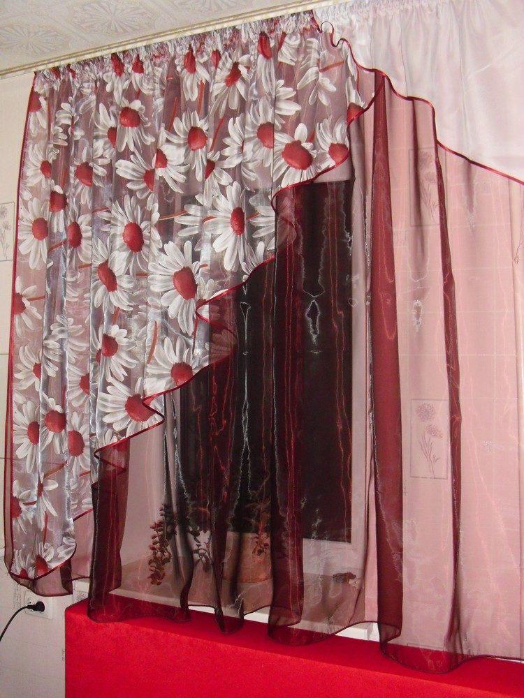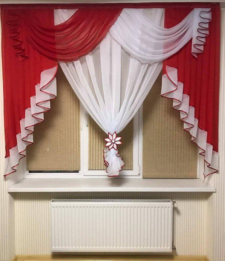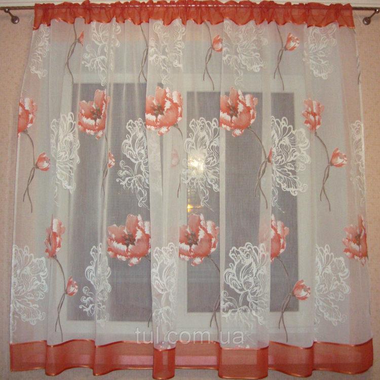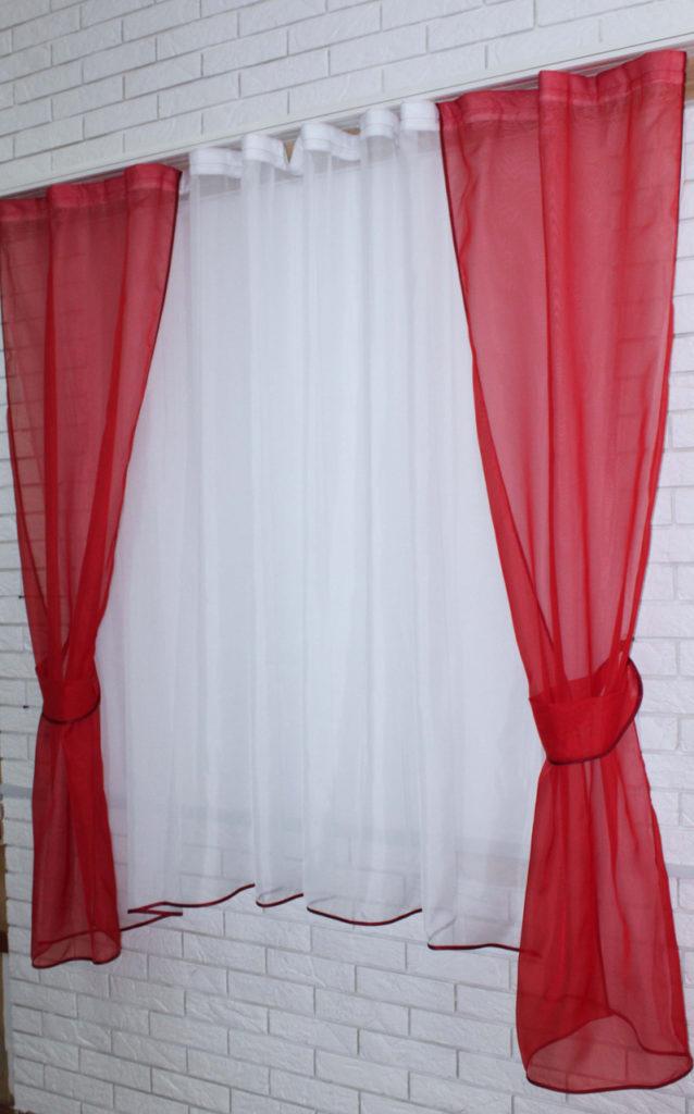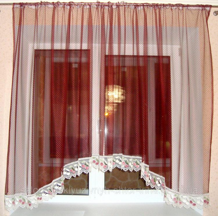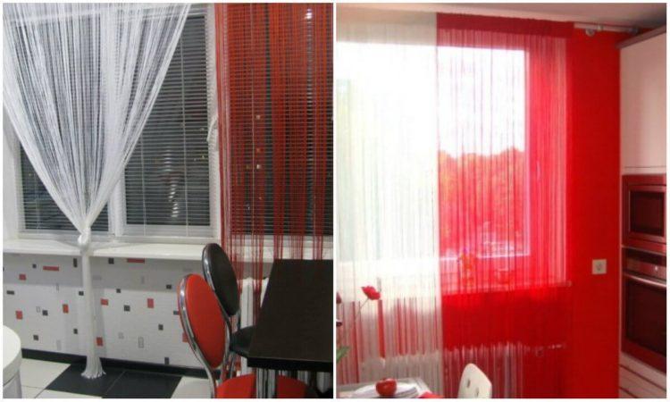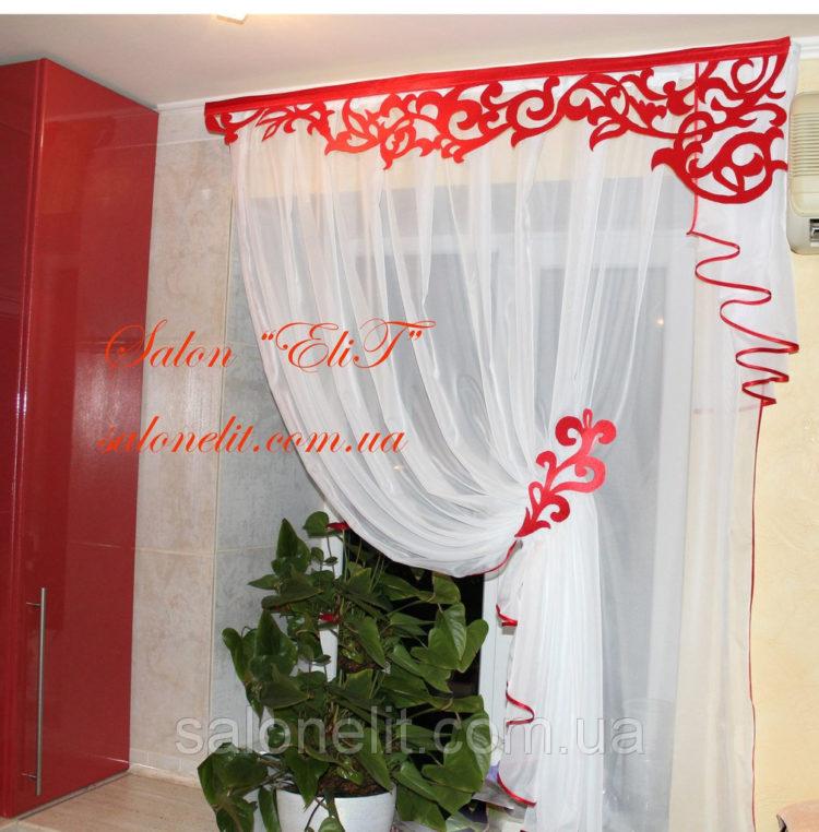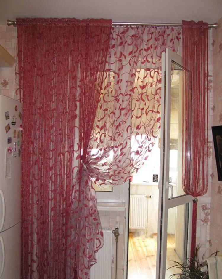 El tul rojo en la cocina corta se verá mucho mejor que largo. En este caso, no elija un tono altamente saturado, incluso si desea hacer un acento brillante.