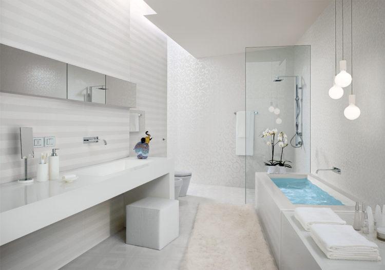 Esta es una opción universal y la más adecuada para el diseño de un baño de tamaños pequeños, que está acabado con azulejos.Después de todo, a menudo las tuberías y los muebles para el baño están hechos de este color. También es una base excelente para acentos brillantes. Y, por supuesto, es capaz de hacer que el interior sea ligero y brillante, aumentando visualmente el espacio.