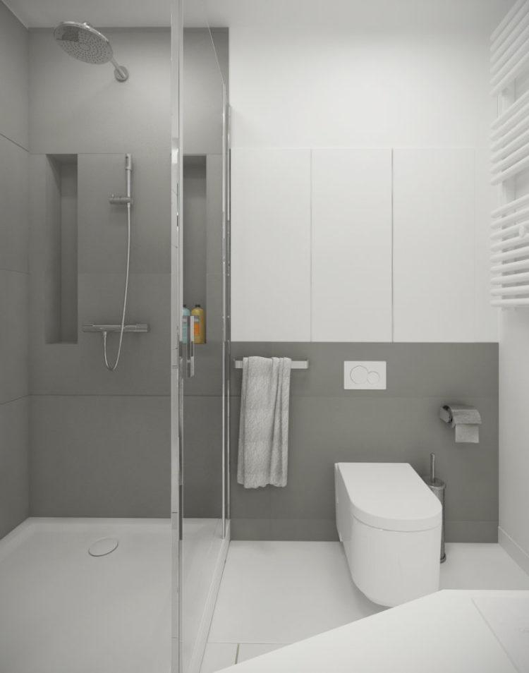 Una combinación de leche y gris es siempre el ganador. Las paredes en este caso están hechas en colores brillantes con puntos de acento en forma de rayas oscuras o inserciones, y el piso está revestido con azulejos gris oscuro. Una combinación de paredes de leche con muebles de color gris oscuro o claro también será beneficiosa. Sin embargo, los artesanos logran hacer una atractiva reparación de baño en Jruschov, completamente en tonos grises, jugando con tonos cálidos y fríos.