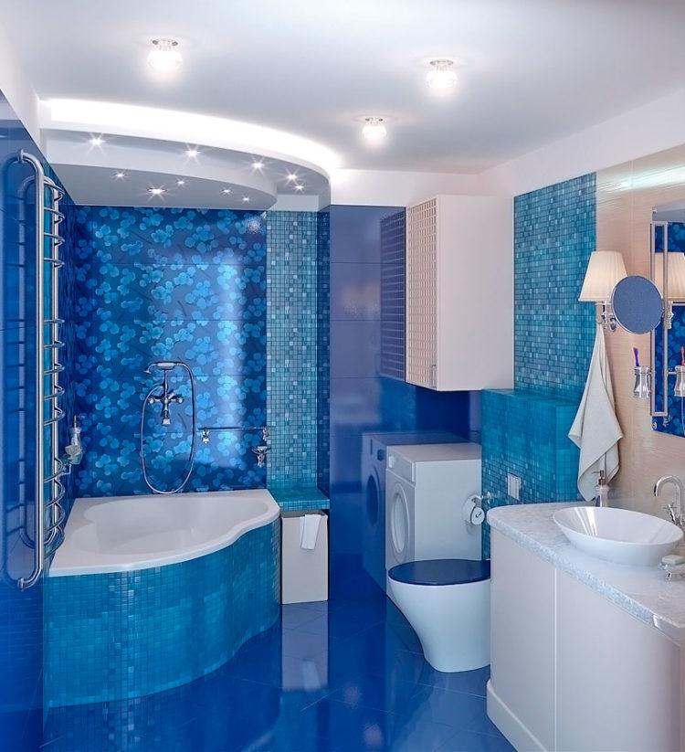 El baño en Khrushchev (diseño que se ve a continuación en la foto) se ve increíble solo si el color azul se combina con otros tonos claros, con mayor frecuencia. El color azul combina bien con los colores blanco, gris, dorado, negro y marrón. Es adecuado para el estilo minimalista, escandinavo y mediterráneo. Haciendo reparaciones en el baño en Jruschov, si lo intentas, puedes encontrar plomería hecha en azul o azul.