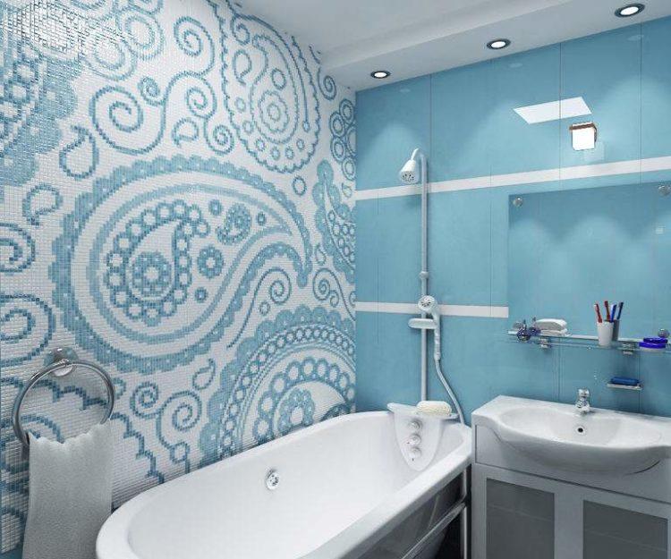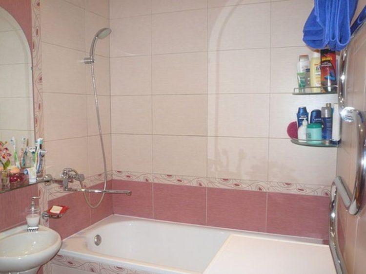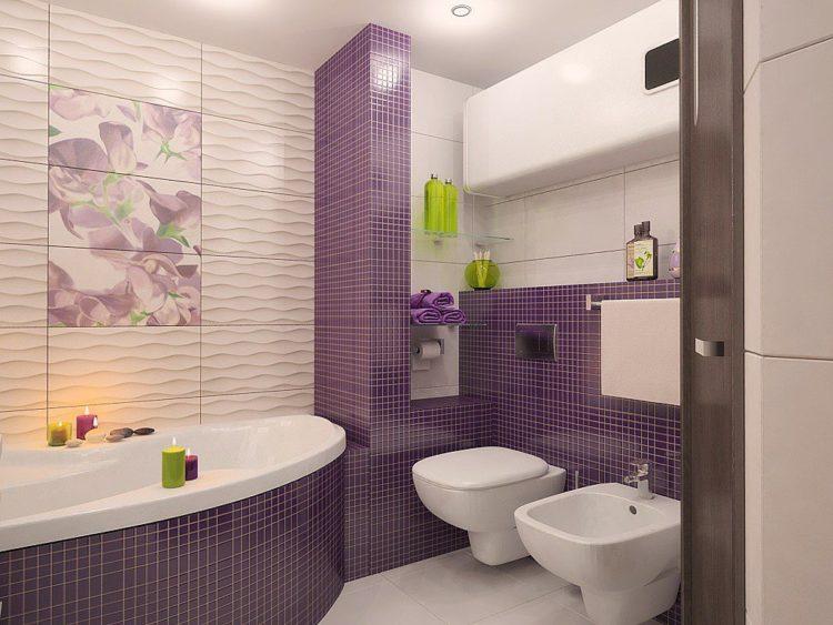Blanco, beige, verde y azul son los más adecuados. También a menudo hay baños en Khrushchev (vea el diseño de la foto a continuación) en tonos amarillos, violetas y burdeos, pero en este caso vienen en combinación con una base blanca u otra base tranquila.