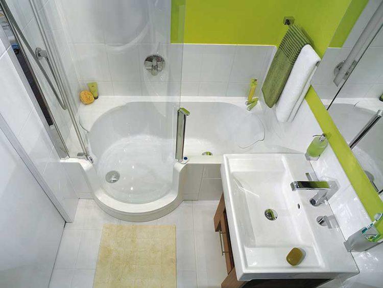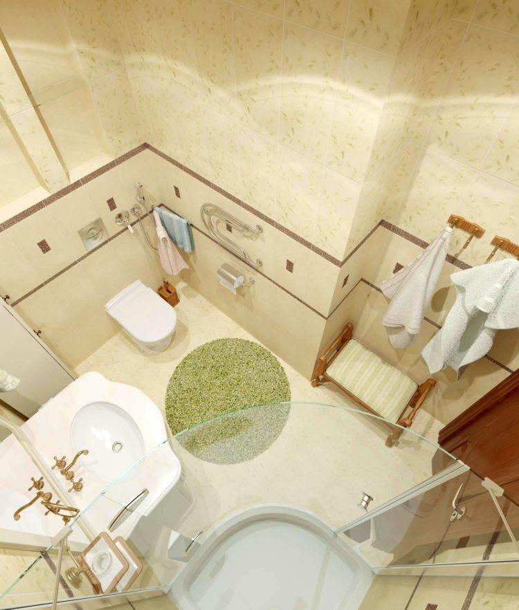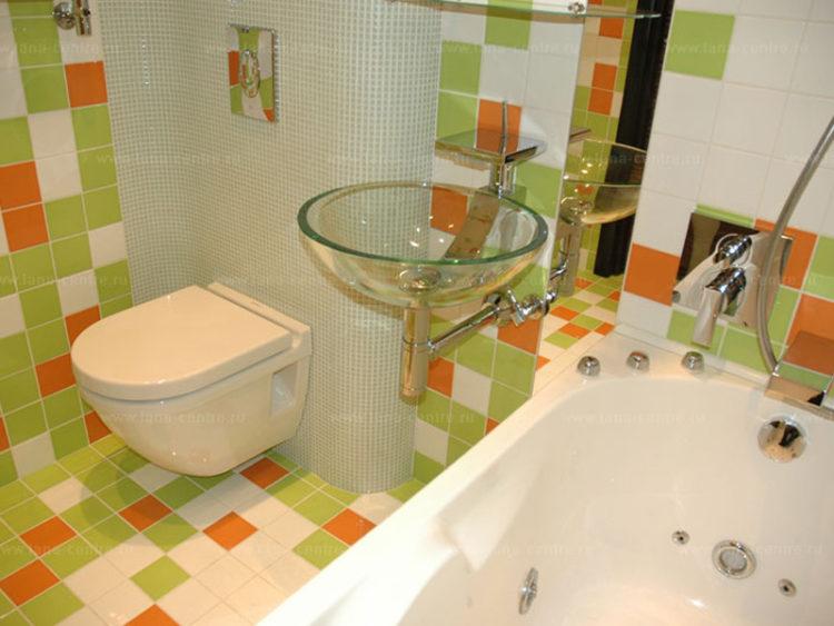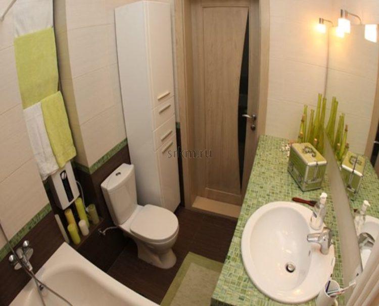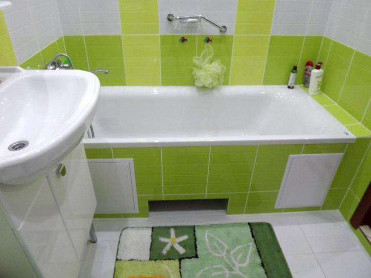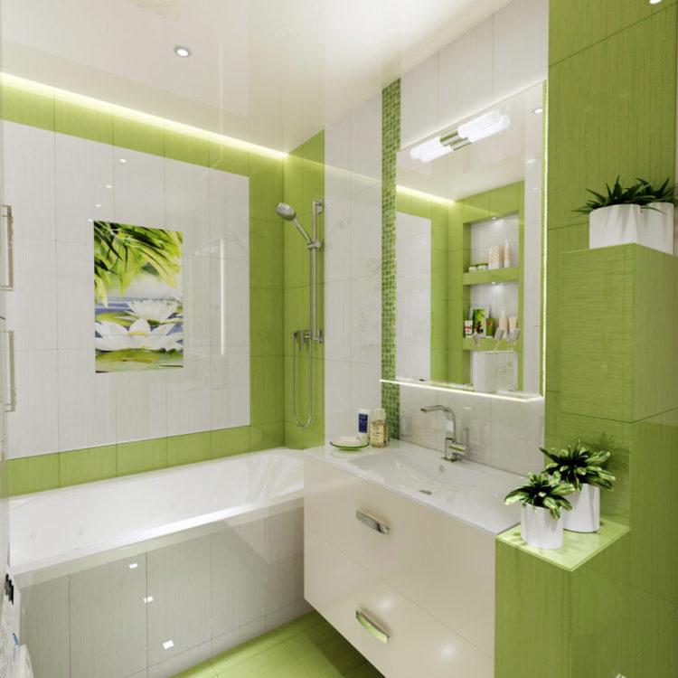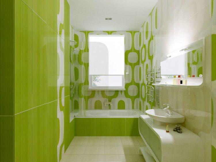 Verde: ideal para crear un diseño de baño en Brezhnevka y Jruschov en dirección fría. Los tonos claros de este color pueden hacer que una habitación sea fresca y espaciosa. A menudo se combinan con otros colores brillantes. Realizando reparaciones en el baño en Jruschov con un baño combinado, este color es adecuado para la decoración de paredes, pisos y textiles. También puede recoger muebles en colores verdes.