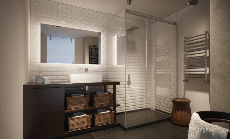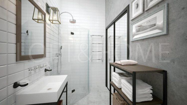 Al elegir muebles en estilo loft, prefiera una geometría estricta. El baño tipo loft requiere un esquema de color consistente. Un baño o ducha de estilo loft puede decorarse con azulejos de todo tipo de imitaciones para hormigón, madera y ladrillo.