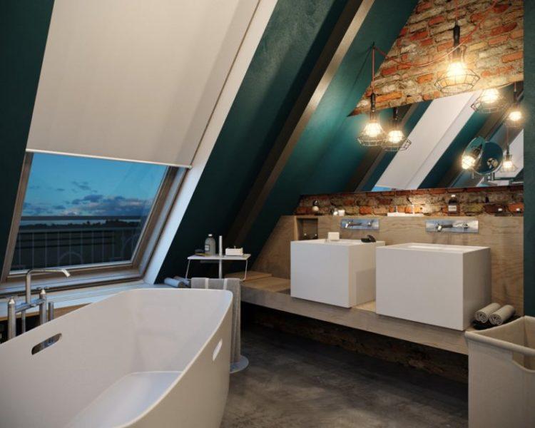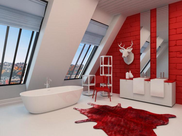 Glamorous loft es un juego con color. Además de los tonos del esquema de color típico, el desván del baño se puede decorar en colores más brillantes. Un lugar especial en esta dirección está ocupado por el color rojo y cualquier tono del mismo.