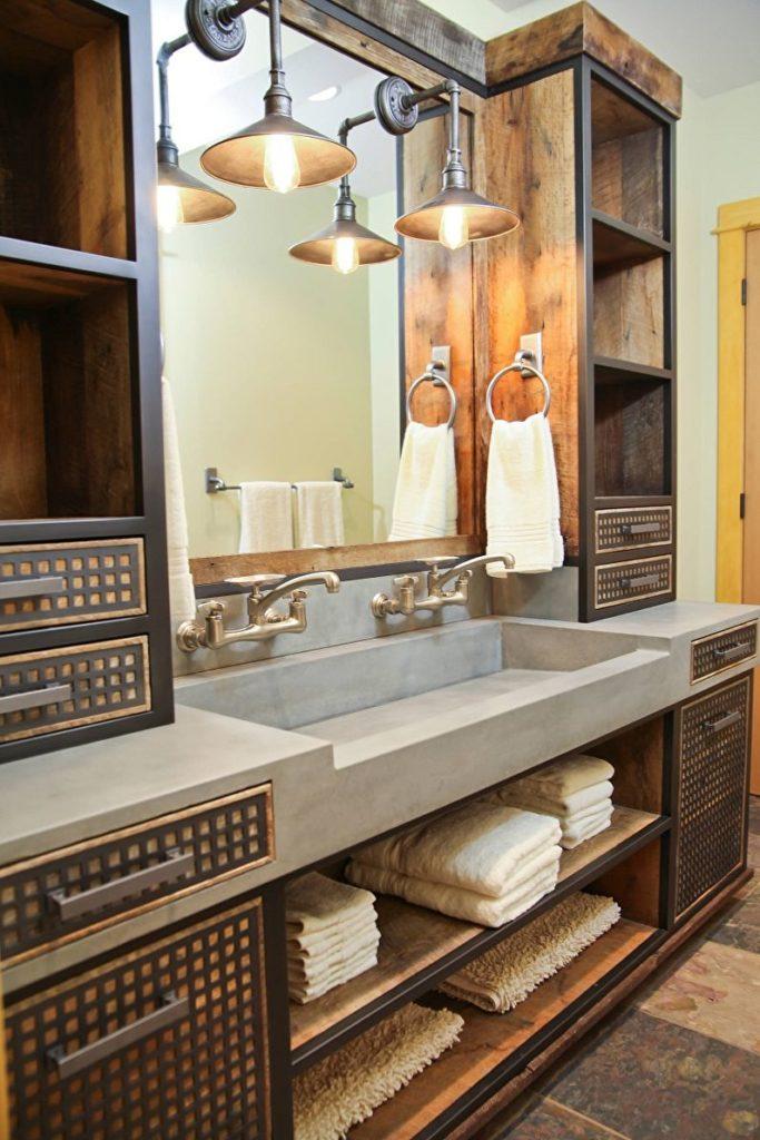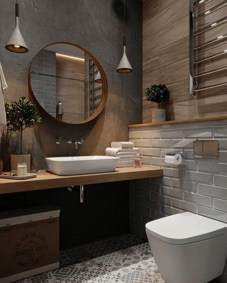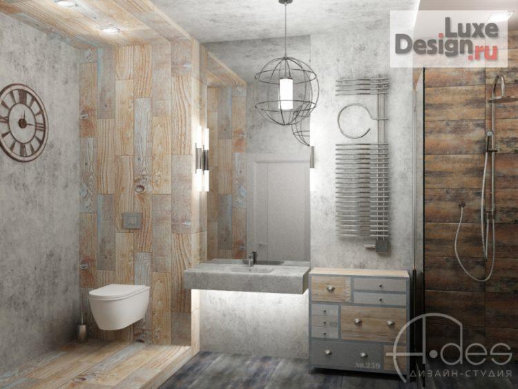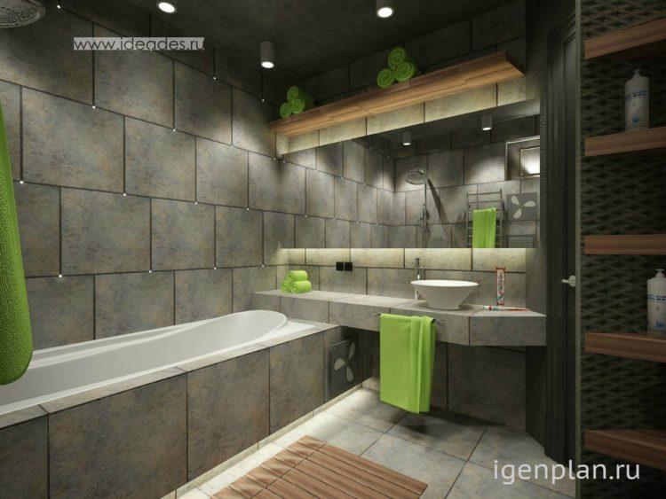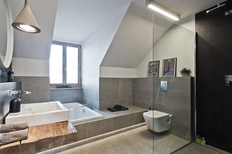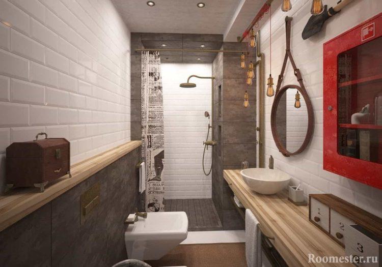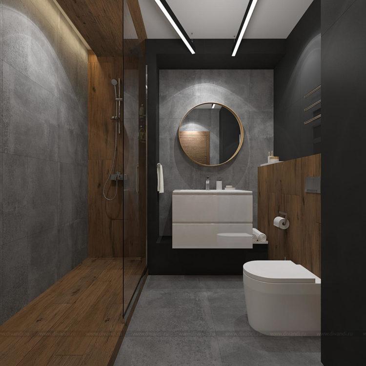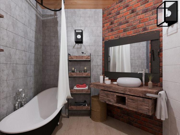 Una solución bastante común para un baño en el estilo loft es un fondo gris común; en las variantes más extremas: hormigón sin acabado. Sobre un fondo gris, las inserciones de madera clara se ven muy expresivas.
