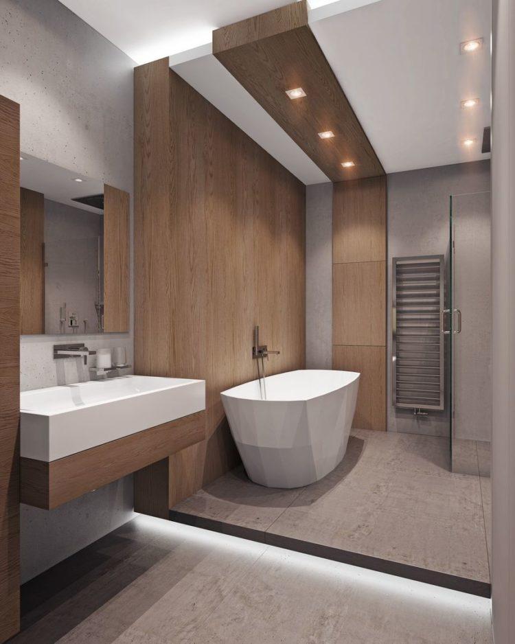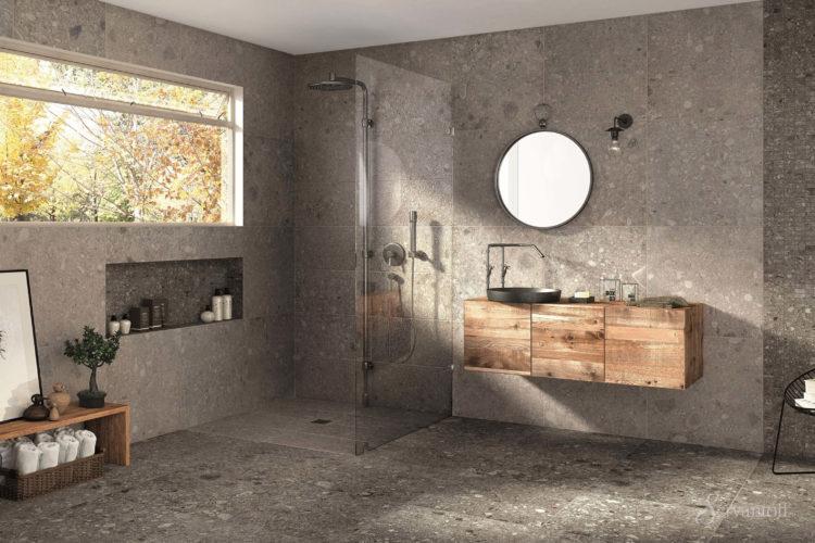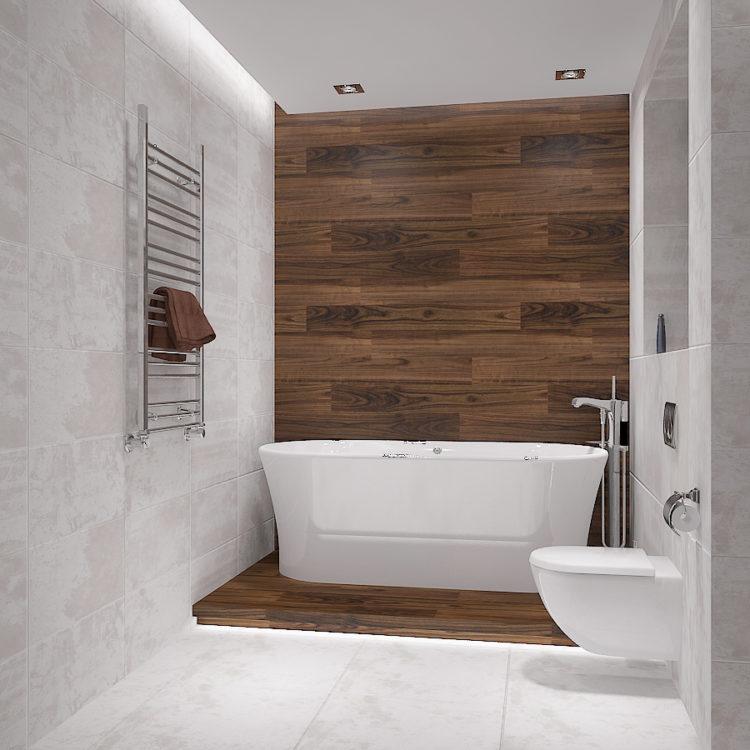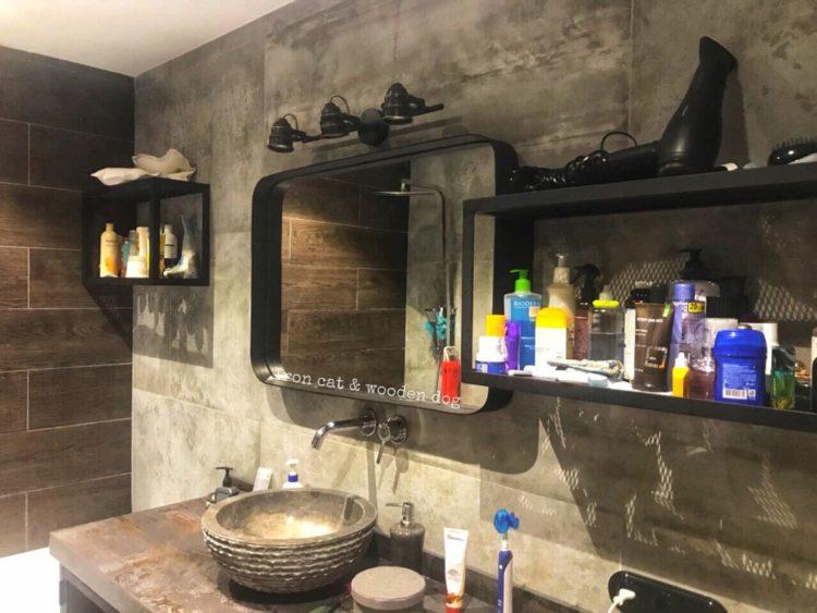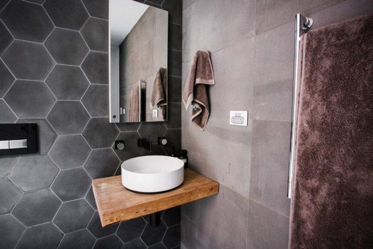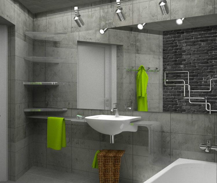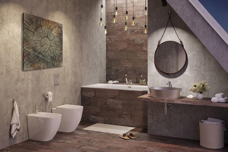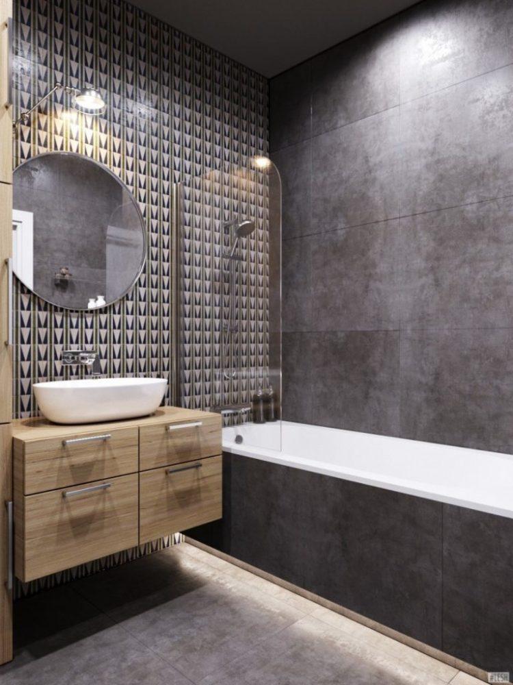 Una solución bastante común para un baño en el estilo loft es un fondo gris común; en las variantes más extremas: hormigón sin acabado. Sobre un fondo gris, las inserciones de madera clara se ven muy expresivas.