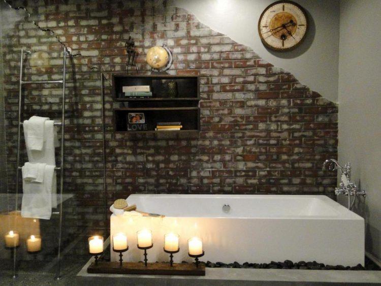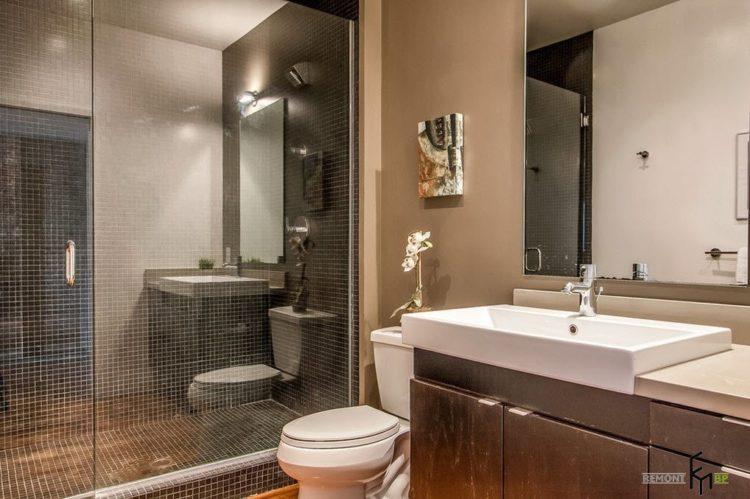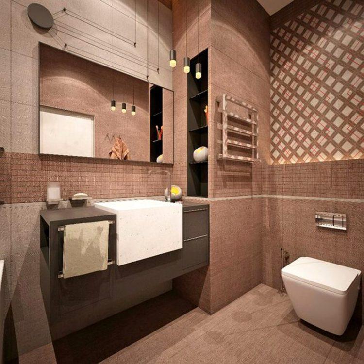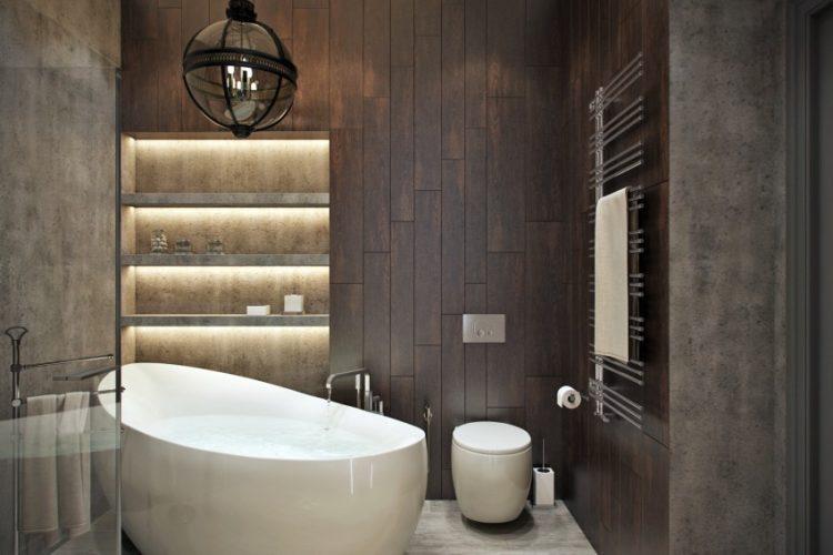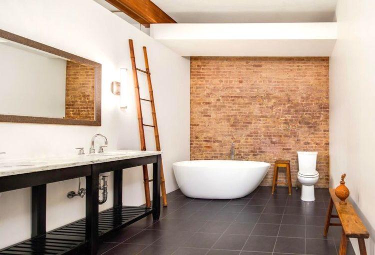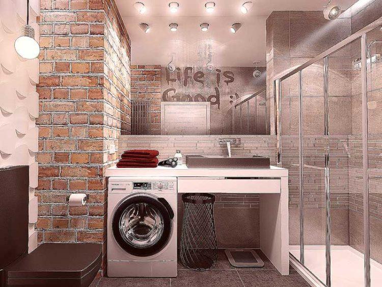 Al crear un estilo loft en el baño, no puede prescindir de tonos marrones (ladrillos, piso de madera). El diseño del baño tipo loft en tonos chocolate intenso está muy bien combinado con elementos de plomería cromados.