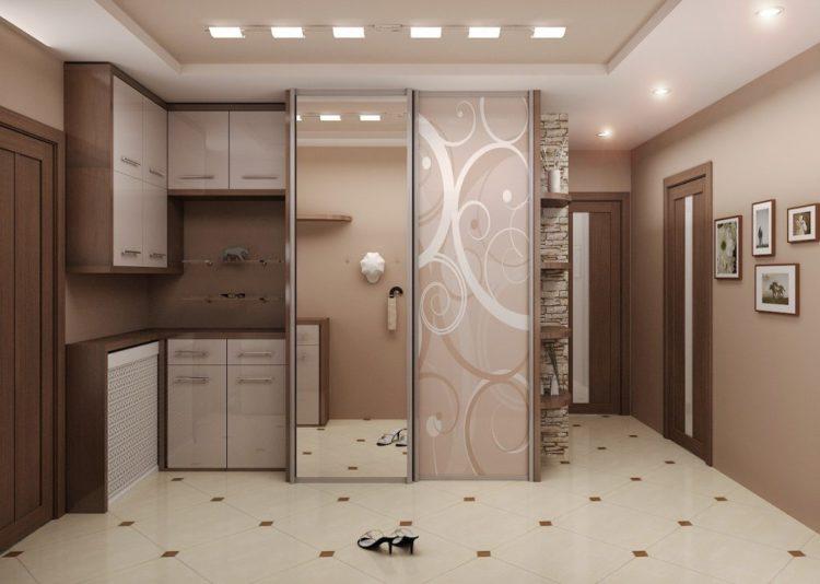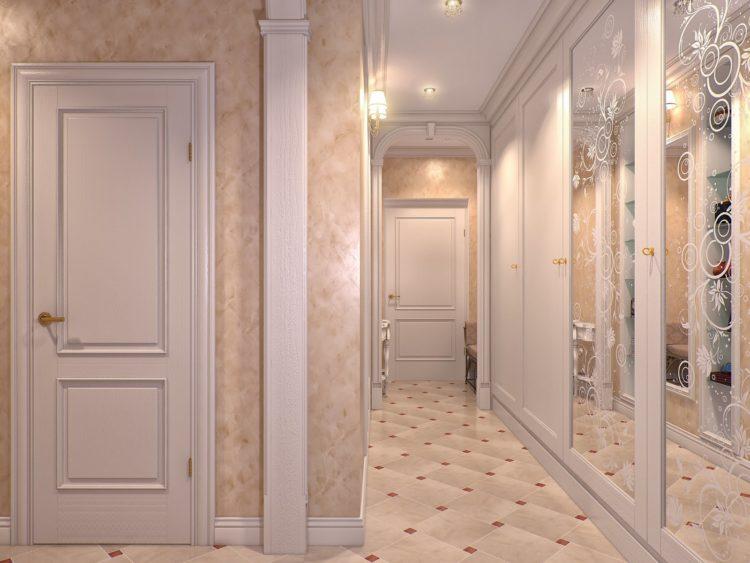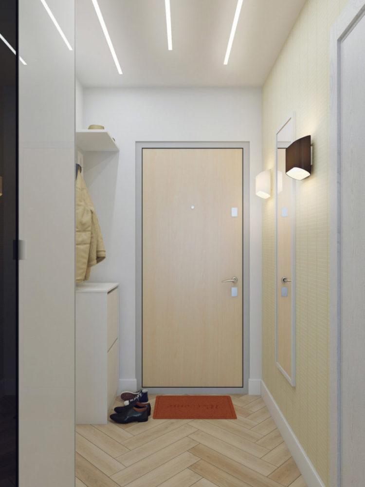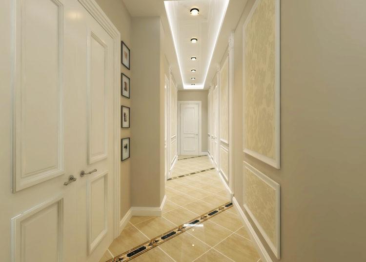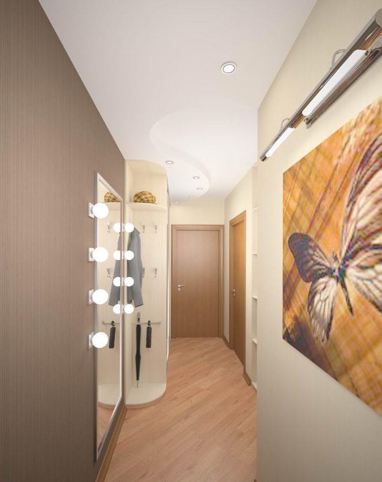 El hall de entrada para un pasillo estrecho, cuyo diseño está hecho en color beige, es una solución bastante práctica que decorará simultáneamente un interior estrecho y ancho con y sin puertas.