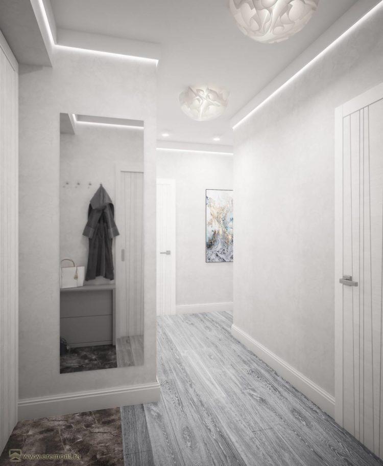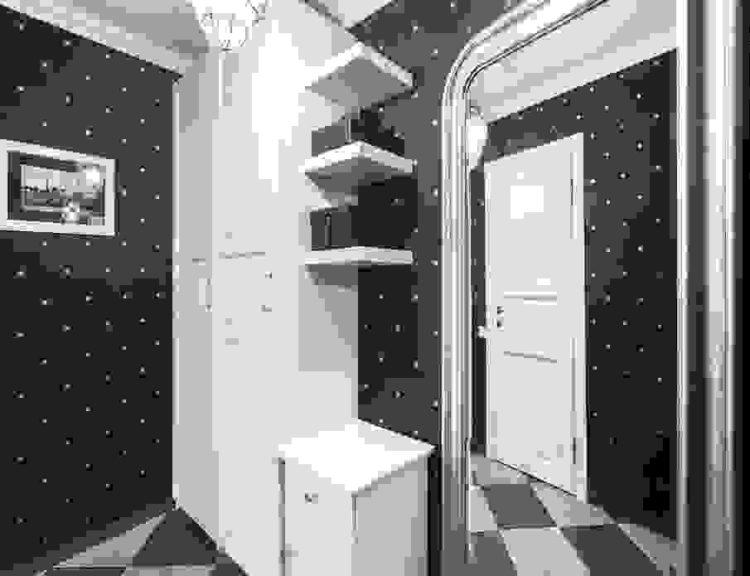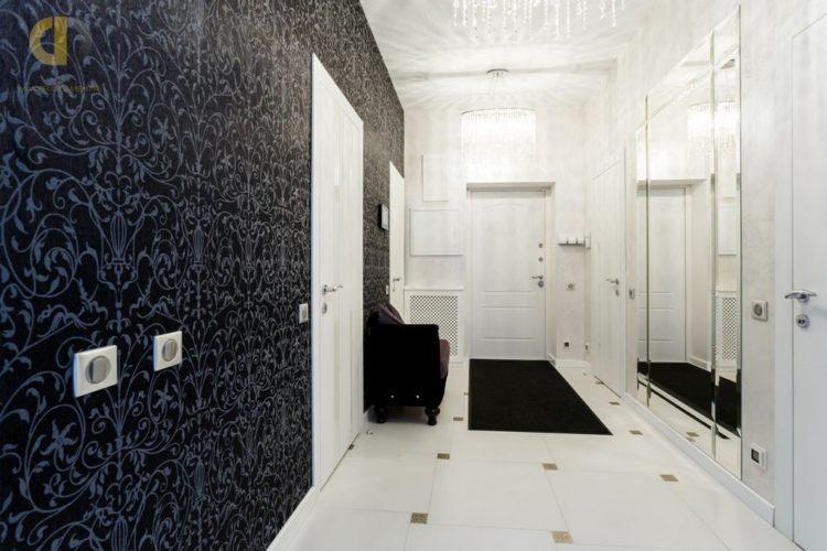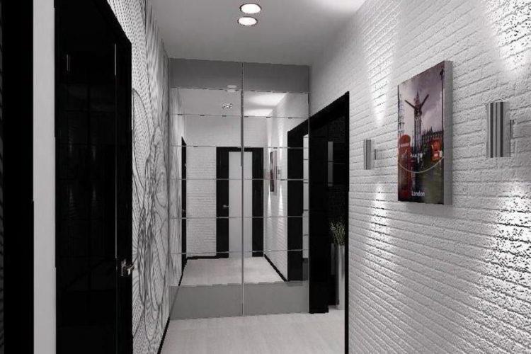 Ejecución estricta para apartamentos de estilo modernista. Se ve muy bien con grandes espejos. Además, con este esquema de color, puede experimentar creando su propio corredor estrecho (mire la foto para diseño, interior, ideas y soluciones).